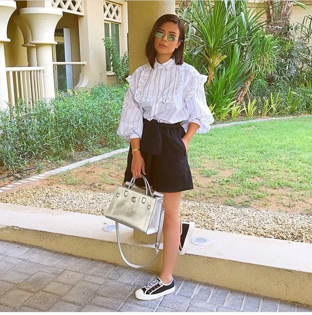 بنفس الخطوط الطولية ولكن مع لمسات الكشاكش، اختارت ديما الأسدي أن ترتدي القميص الأبيض مع تنورة قصيرة ميكرو لإطلالة كاجوال، أكملتها بالسنيكر الأسود.