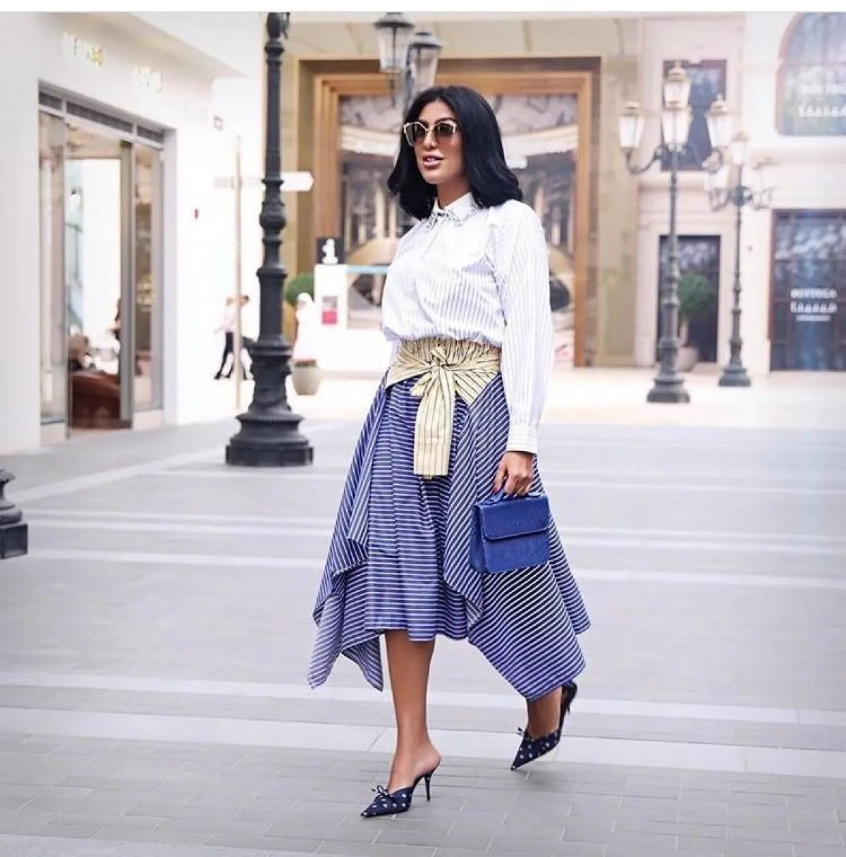 بينما يمكنهن الاعتماد على القميص المخطط بالطول لكي يظهرن بشكل أنحف، مثلما اختارت المدونة دانا الطويرش مع تنورة عالية الخصر واسعة قليلًا، وحزام، لكي تبدو أكثر رشاقة.