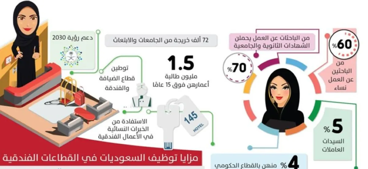 وأضاف العلاف، بحسب صحف محلية، أن العديد من السعوديات أثبتن قدرتهن على العمل لدى القطاعات الفندقية، لا سيما أنهن يمتلكن مهارات مهنية ومعرفية، إذ لم يعد الأمر مقصوراً على وظيفة محددة بل توسع ليشمل المسارات الوظيفية الفندقية كافة.