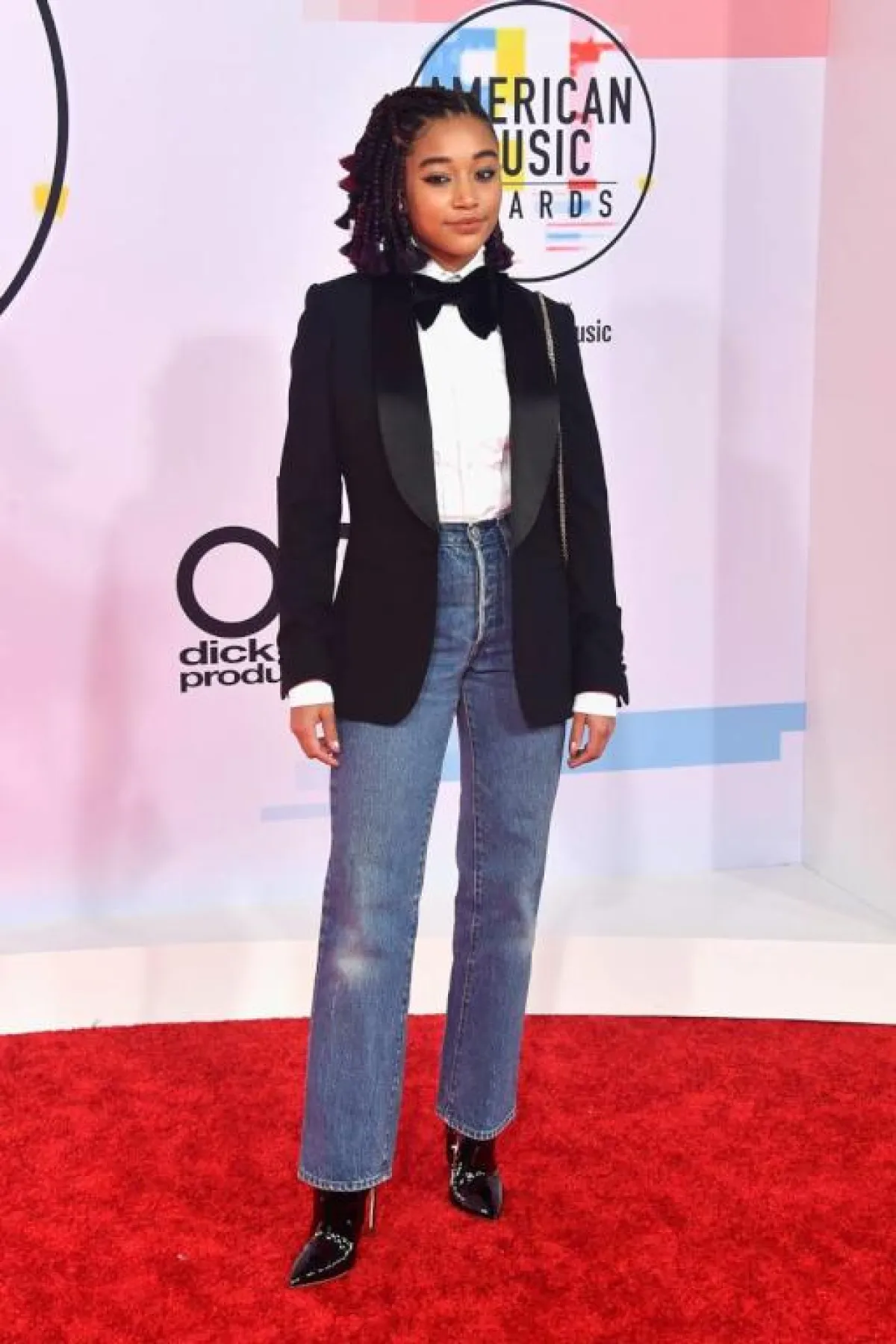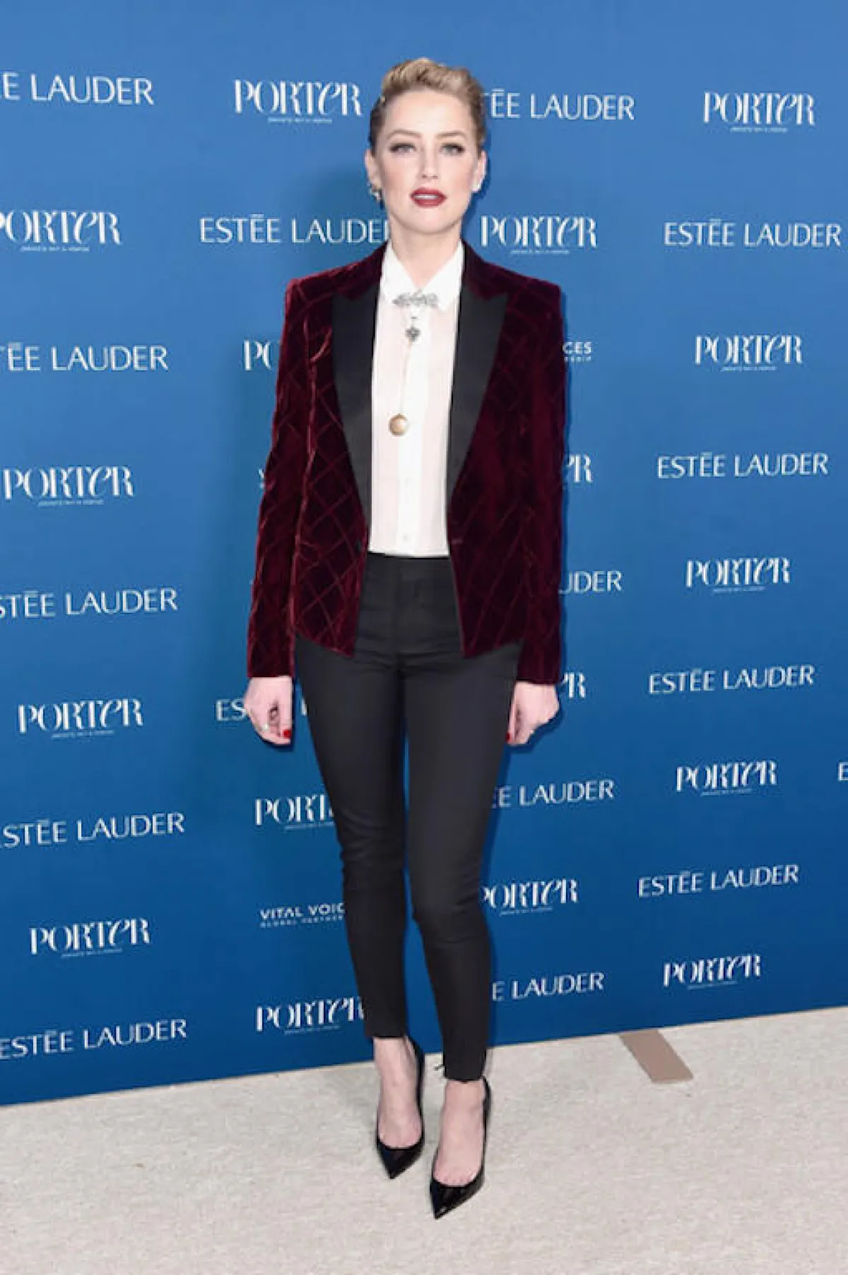 الممثلة الشابة “أمبر هيرد” Amber Heard اختارت اطلالة أنيقة في بدلة من “سانت لوران” Saint Laurent عبارة عن جاكيت بليزر من المخمل باللون العنابي الداكن، نسقتها مع بنطلون أسود بقصة ضيّقة وقميص أبيض، وحذاء بكعب عالٍ من الجلد الأسود، وقد جمعت بين الأنوثة والعصرية في هذا اللوك.