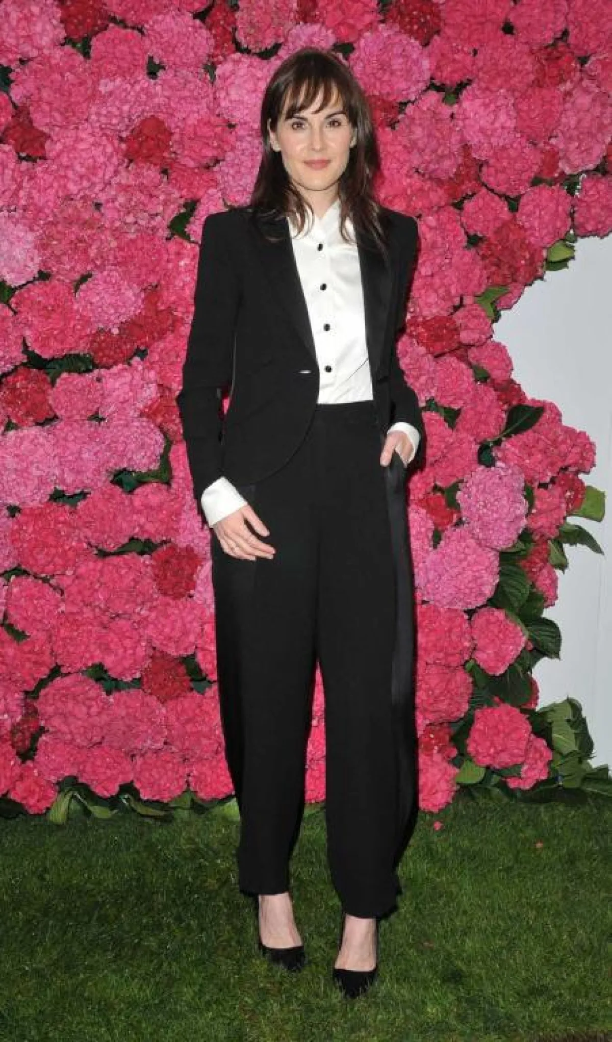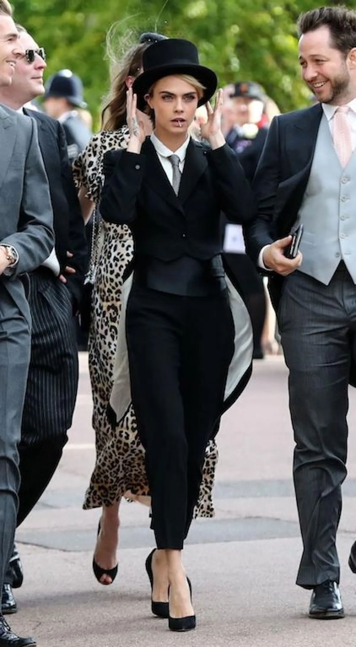 كذلك شاهدنا الممثلة وعارضة الأزياء “كارا ديليفينغ” Cara Delevingne في الزفاف الملكي للأميرة أوجيني، وقد اختارت بدلة رسمية باللون الأسود، نسقت معها قميصًا أبيض، وربطة عنق رمادية، وأكلمت اللوك بقبعة سوداء، وقد بدا اللوك ذكوريًّا، لولا أنها استعانت بحذاء أسود بكعب عالٍ، أضافت من خلاله لمسات أنثوية ناعمة.