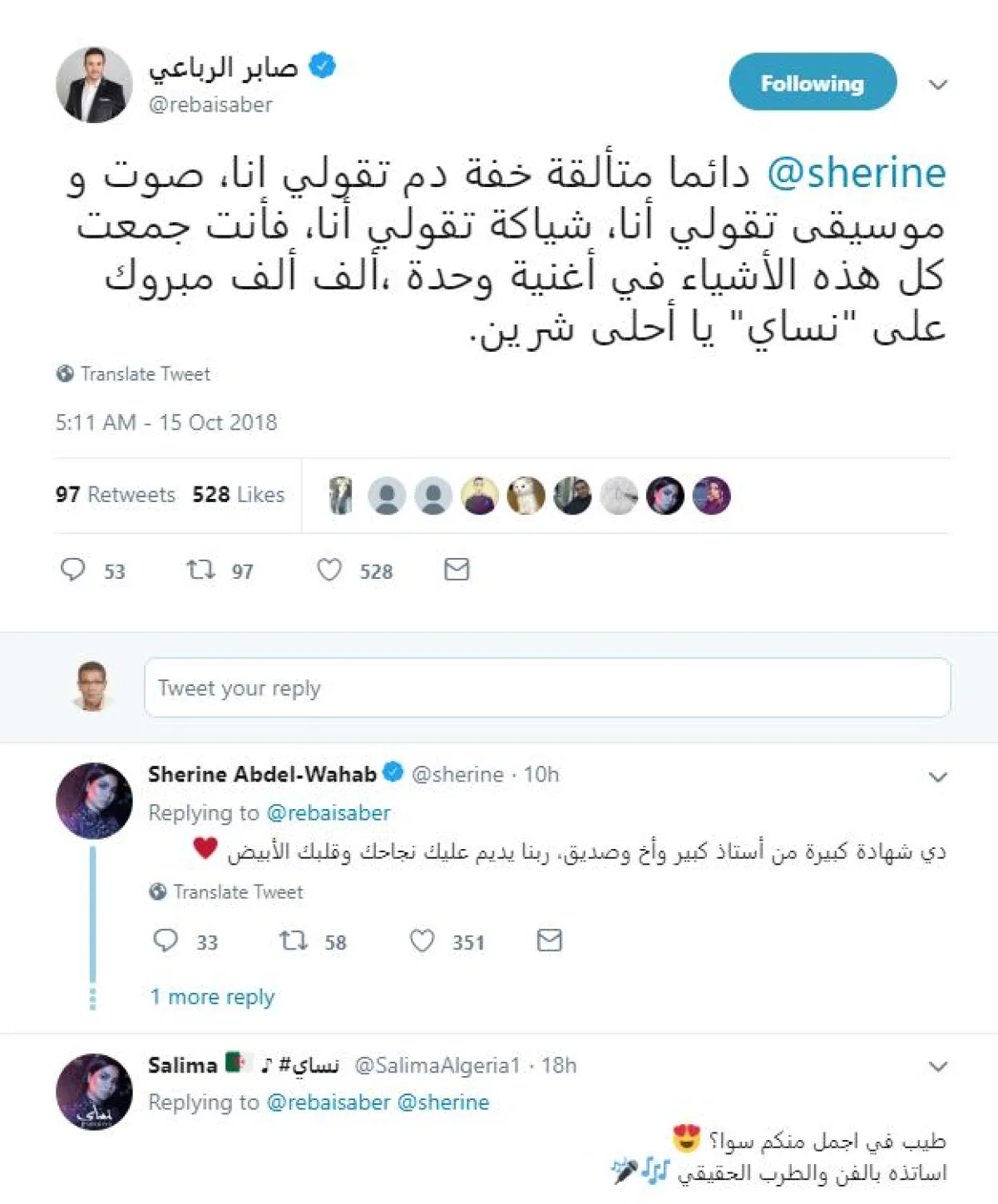 شيرين عبد الوهاب ردت على الفور بتغريدة قالت فيها: دي شهادة كبيرة من أستاذ كبير وأخ وصديق، ربّنا يديم عليك نجاحك وقلبك الأبيض، وتدخّل متابعو النجمين بنشر صور ذكرياتهما من برنامج "ذا فويس"، وتمنوا أن تسود "العلاقة المحترمة والراقية" بين نجوم الفن دومًا.