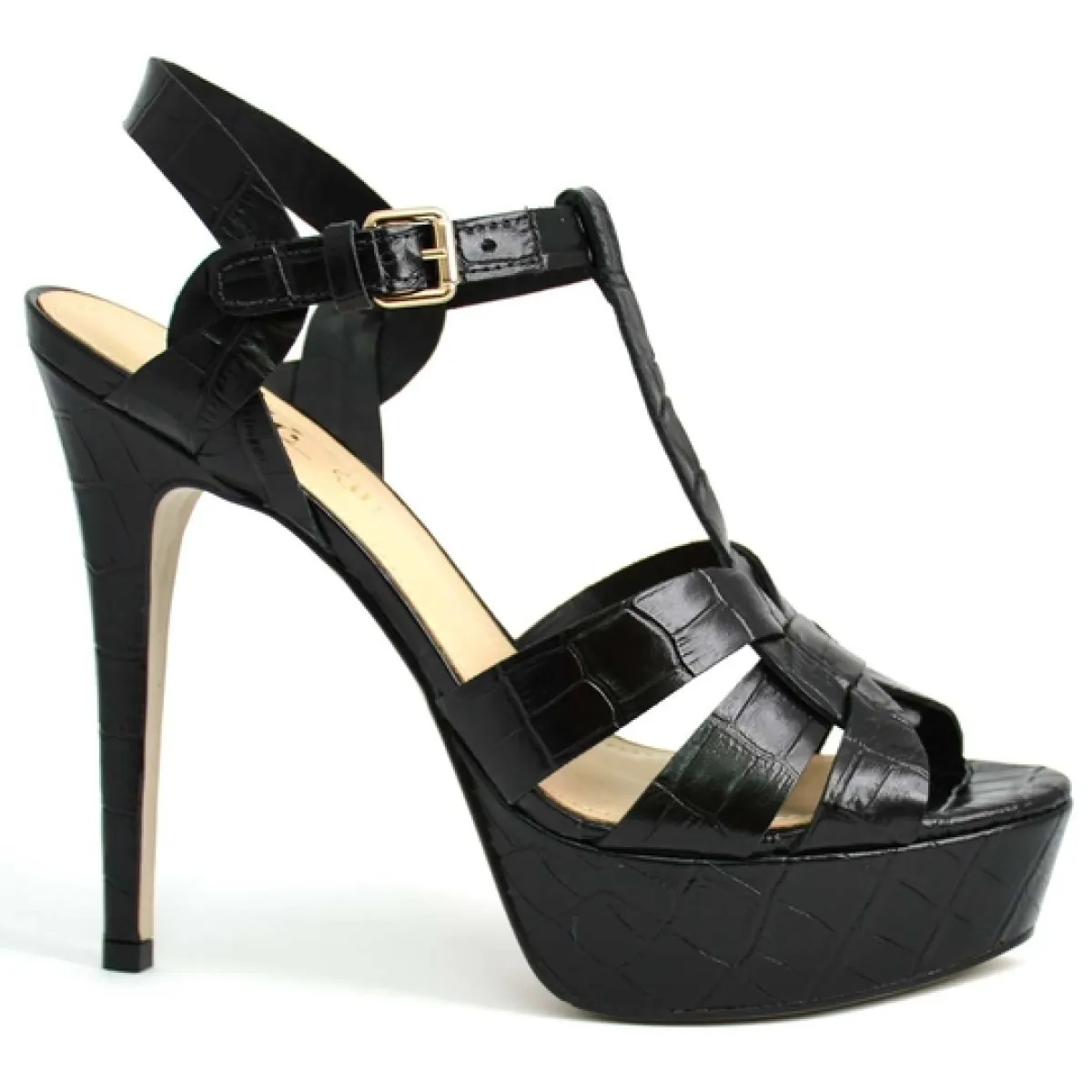 • صندل بكعب رفيع، بطبعة جلد الأفعى، أسود اللون للنساء، من «شيك شوز»