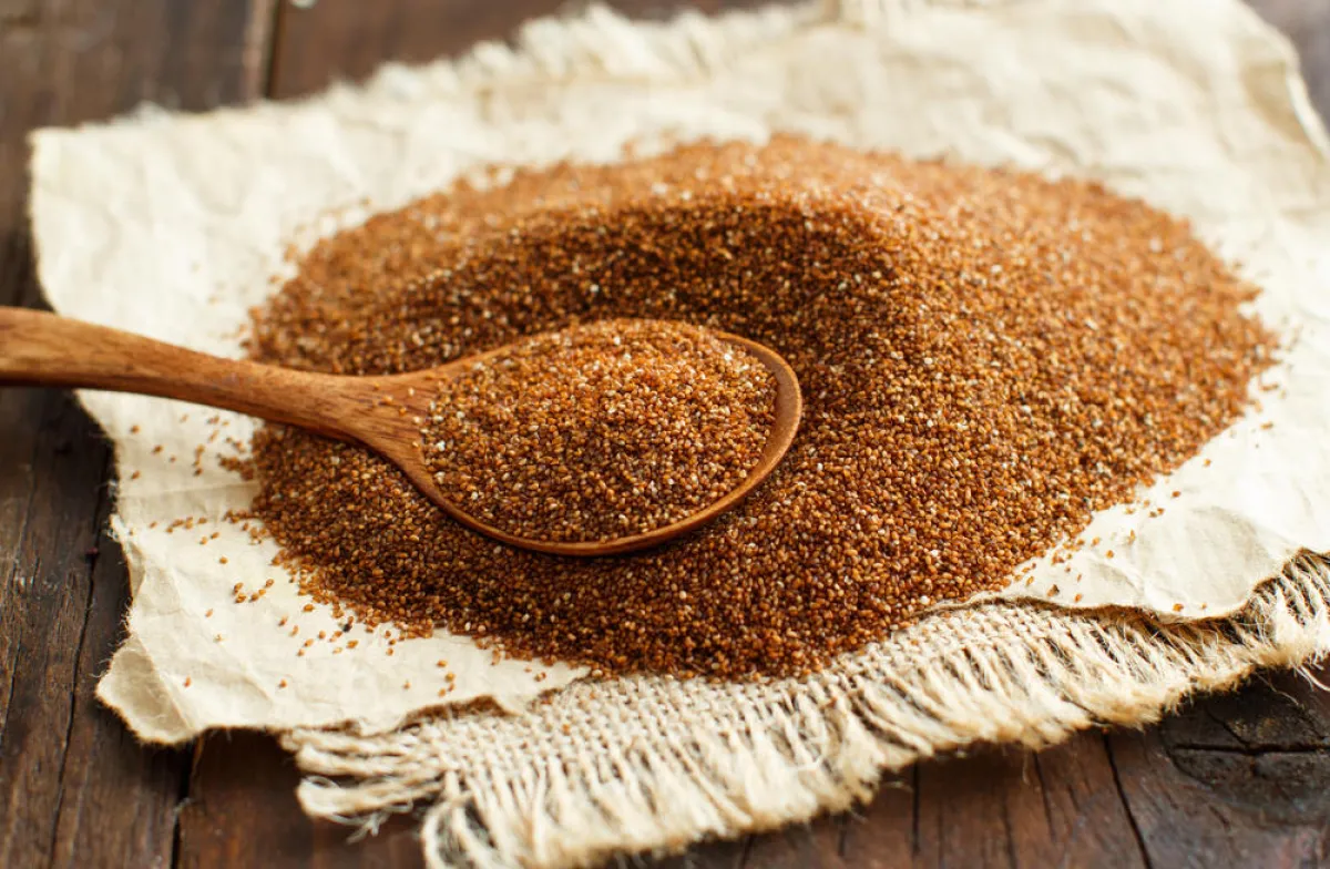 يخلو التيف من الجلوتين، كما أنَّه غنيٌّ بالكالسيوم والفيتامين "ج" والحديد والألياف والنشاء المقاوم. ونظرًا إلى أنه صغير الحجم، ينبغي تناوله من دون تقطيع.