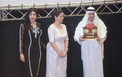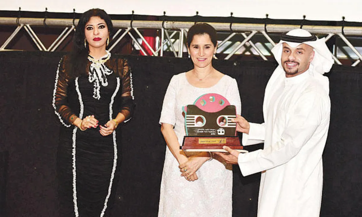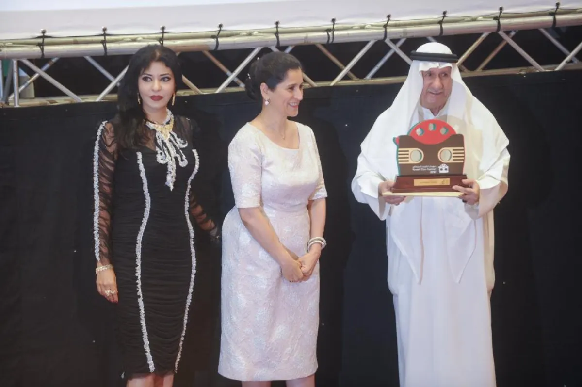 ناصر عبد الله المحيلان يتسلم جائزة تكريم والده من الشيخة إنتصار الصباح، وتبدو في الصورة المدير الفني للمهرجان "فاطمة الحسينان"