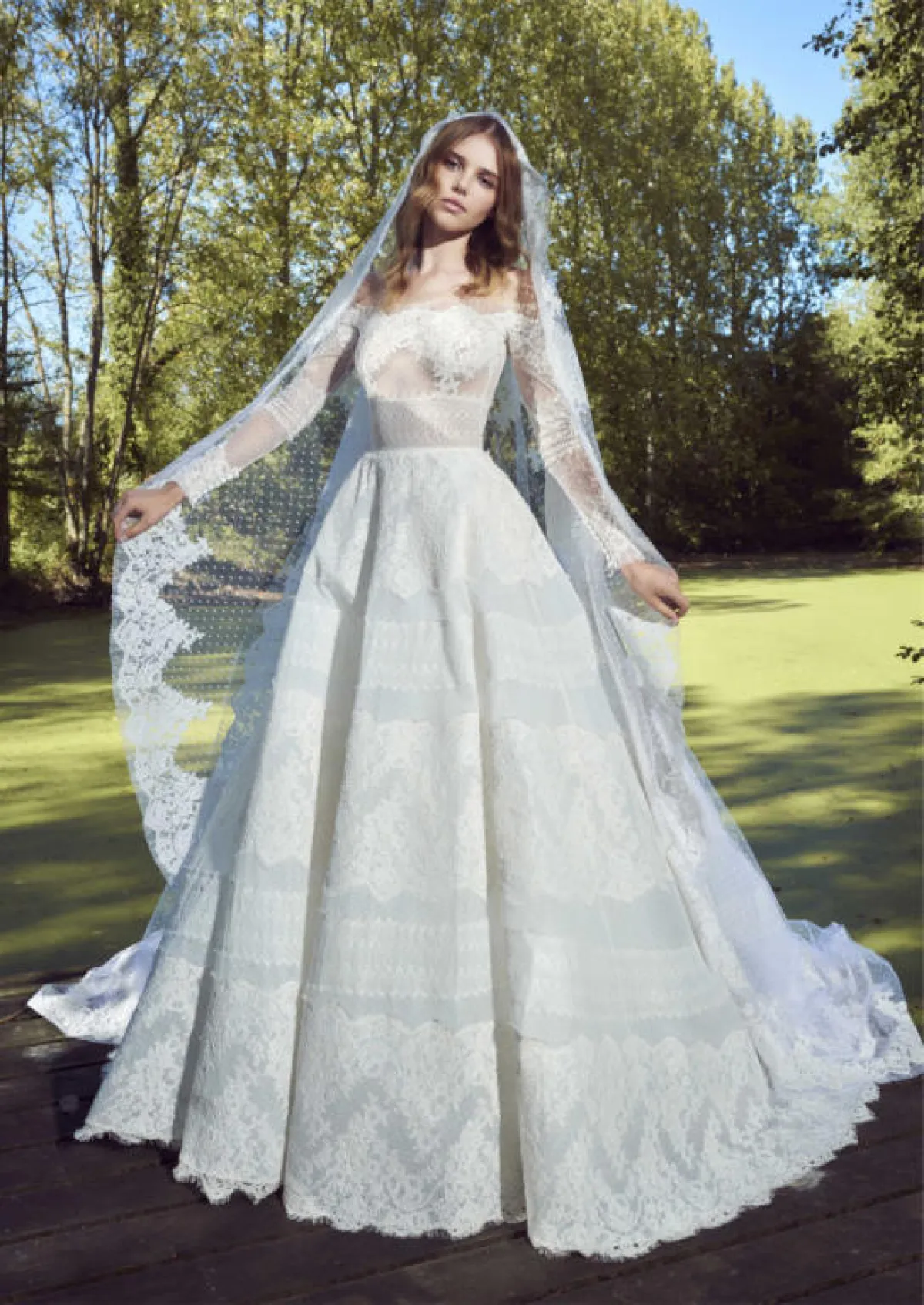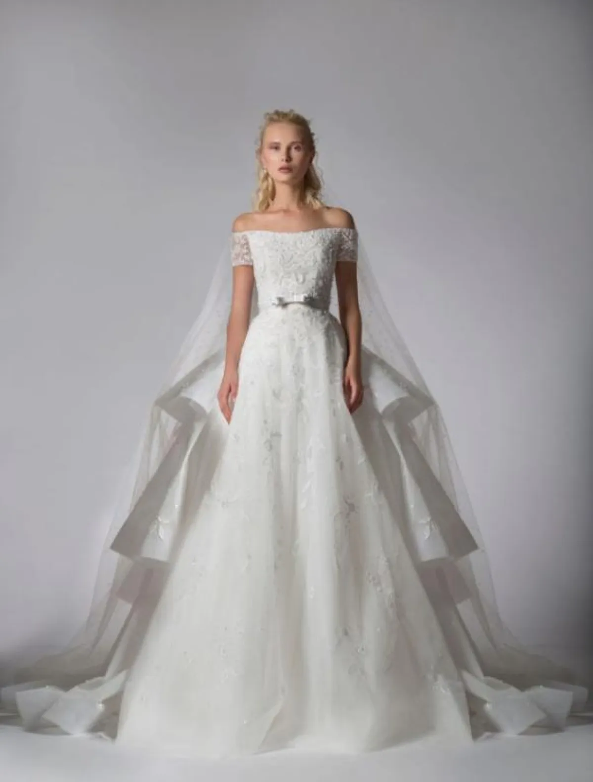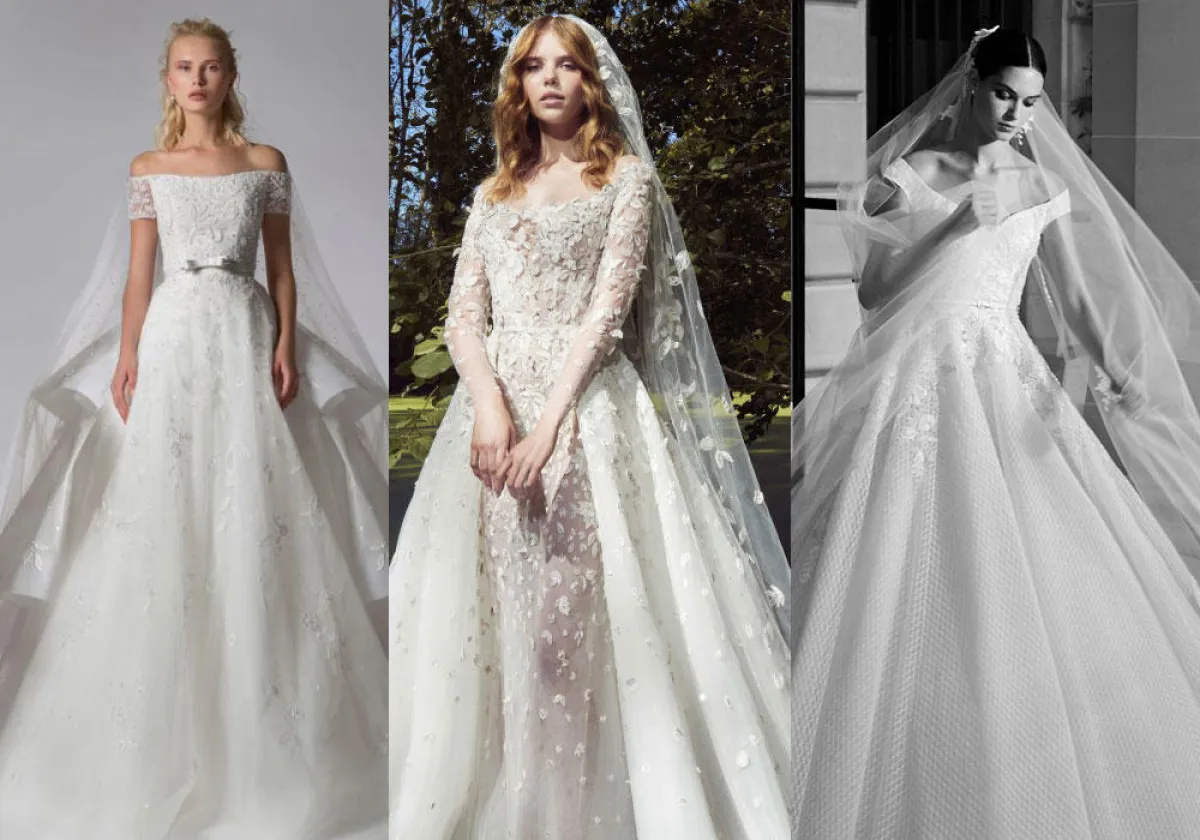 ومثل العادة، قدم المصمم اللبناني إيلي صعب Elie Saab فساتين زفاف ناعمة وراقية، بتصاميم منفوشة Ball Gown وأقمشة فاخرة، سواء فساتين حمّالات، فساتين بأكمام طويلة وفساتين أوف شولدر Off Shoulder.