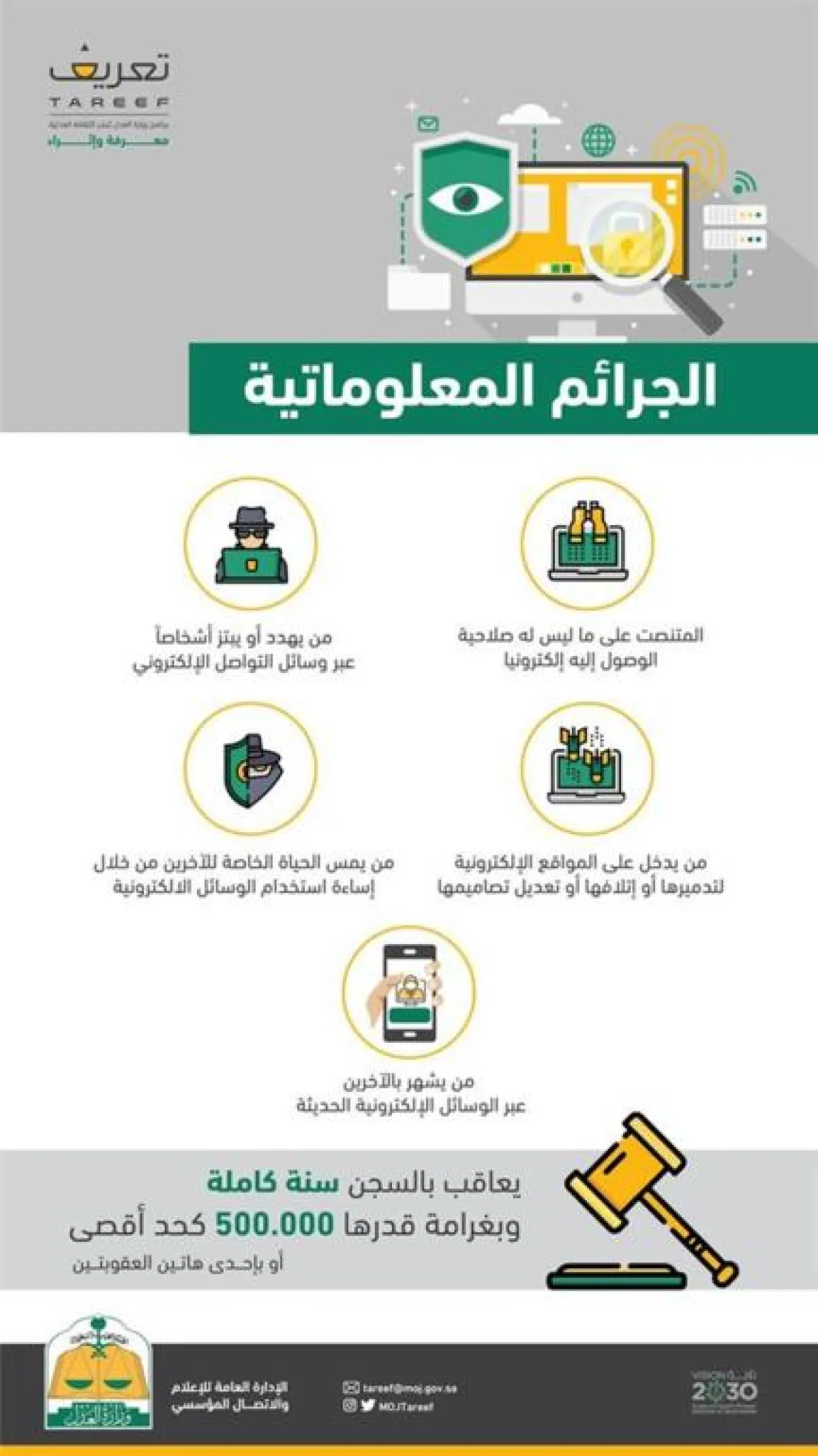 وأبانت الوزارة، أن نظام مكافحة الجرائم المعلوماتية يعاقب بالسجن مدة عام والغرامة بمبلغ 500 ألف ريال، كل من يتنصت على ما ليس له صلاحية الوصول إليه إلكترونياً.