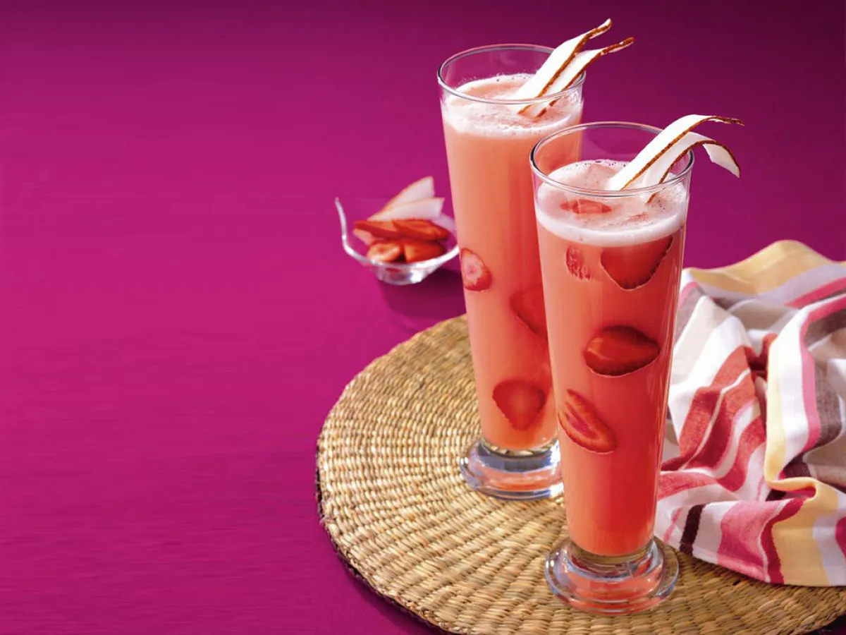 3-توضع المثلّجات بنكهة الأناناس في أكواب التقديم، ثمّ تضاف شرائح فاكهة الفراولة ويسكب فوقها المزيج. تزيّن الأكواب بشرائح جوز الهند، ثمّ يقدّم العصير على الفور.