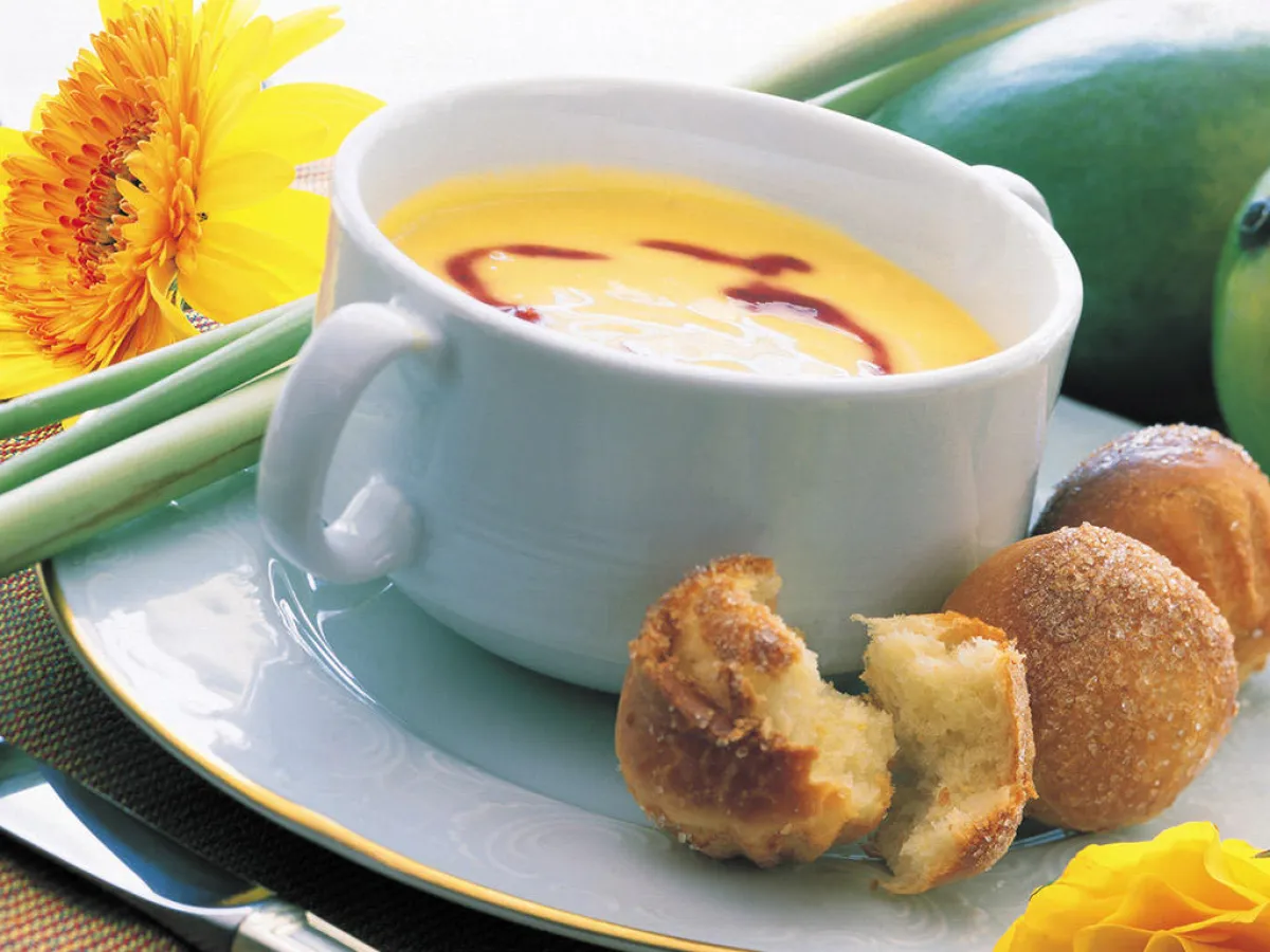 2-في مقلاة كبيرة تذوّب الزبدة بدرجة حرارة متوسّطة، ويُضاف الزيت. ثمّ تقلى الخضر مع جوزة الطيب ونصف كميّة سائل الزنجبيل ونصف كمية السكّر، لمدّة 15 دقيقة. بعدها، يُسكب مرق الدجاج والكريما فوق الخضر المقلية. وعندما يغلي هذا المزيج، تخفّض الحرارة، وتغطّى القدر، وتترك على نار هادئة لمدّة 30 دقيقة.