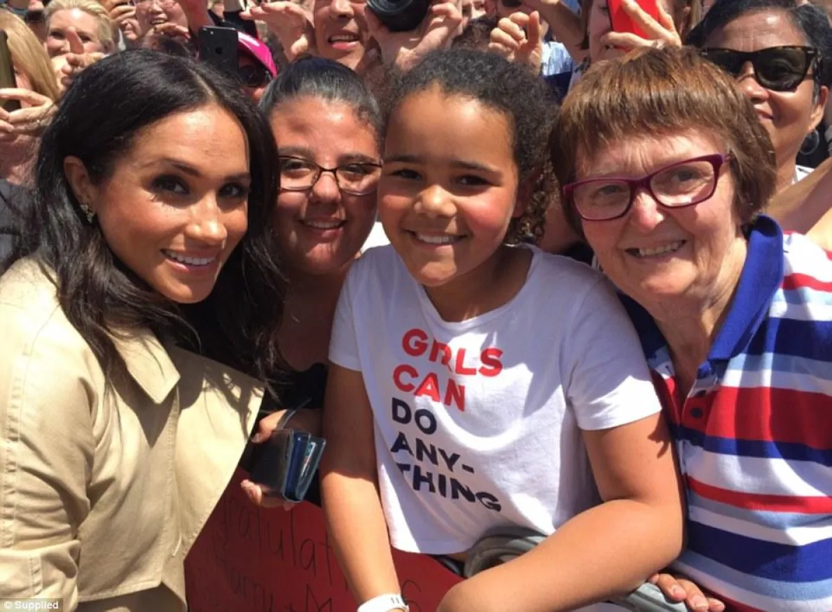 وفي التفاصيل، فأثناء جولتهما في مدينة سيدني الأسترالية، لاحظ الأمير هاري إحدى الفتيات الصغيرات التي تدعى Sethunya Gibbons وترتدي كنزة مكتوب عليها "الفتيات يستطعن فعل أيّ شيء"، وما لفته أكثر، الشبه بينها وبين زوجته ميغان ماركل وهي صغيرة.