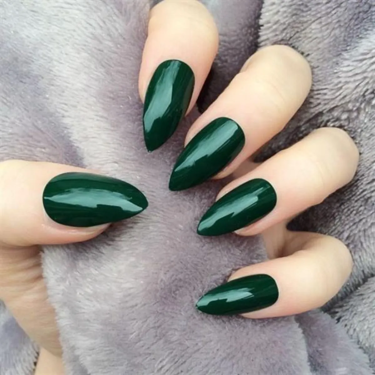 مناكير باللون الزيتي يناسب أظافركِ سواء كانت طويلة أو متوسّطة الطول، يتلاءم مع ملابس الخريفية. ويمكن أن تضيفي لمسة من البريق إلى ظفر واحد.