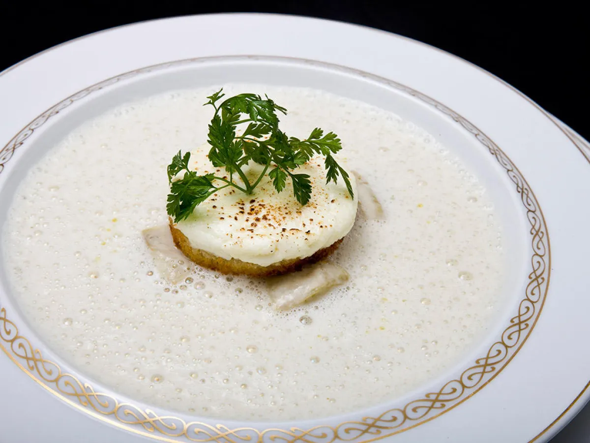-8طريقة التقديم: يوضع الخرشوف والبصل في منتصف طبق التقديم، يعلوه "التوست"، ثمّ يُسكب الحساء حوله. كادر نصيحة "الشيف" يمكن استبدال الخرشوف الطازج بالمجلّد.