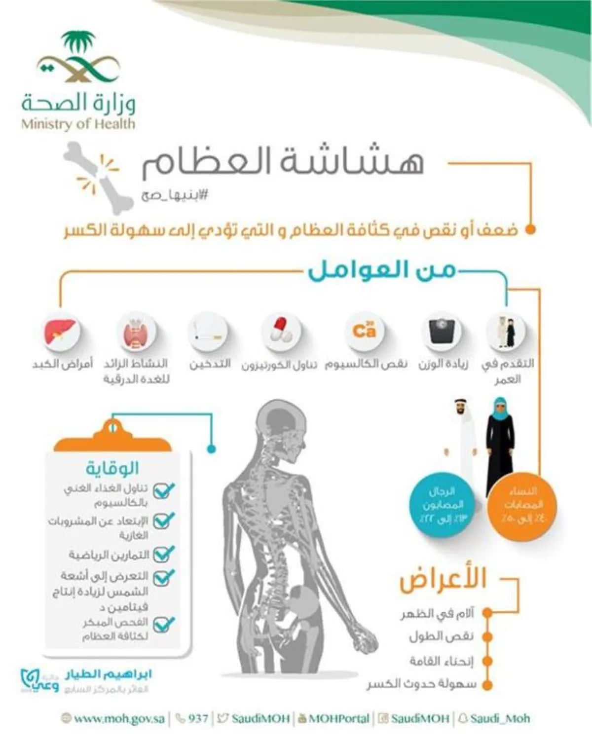 بمناسبة اليوم العالمي لمرض "هشاشة العظام"، نصحت وزارة الصحة بأهمية حماية العظام من الإصابة بالهشاشة، وذلك من خلال تناول الغذاء الغني بالكالسيوم، وتجنب المشروبات الغازية، والحرص على التعرض لأشعة الشمس، وممارسة التمارين الرياضية.