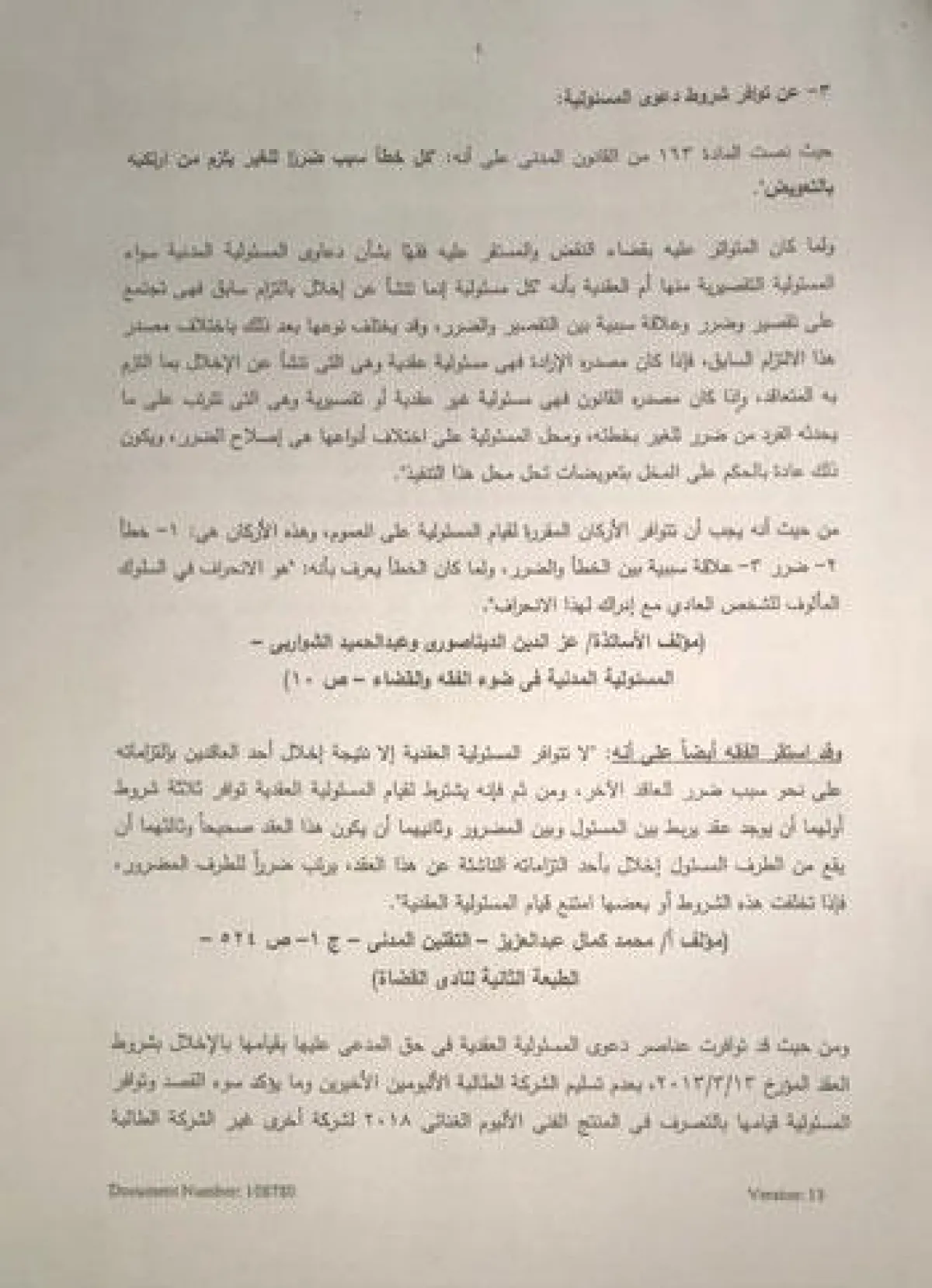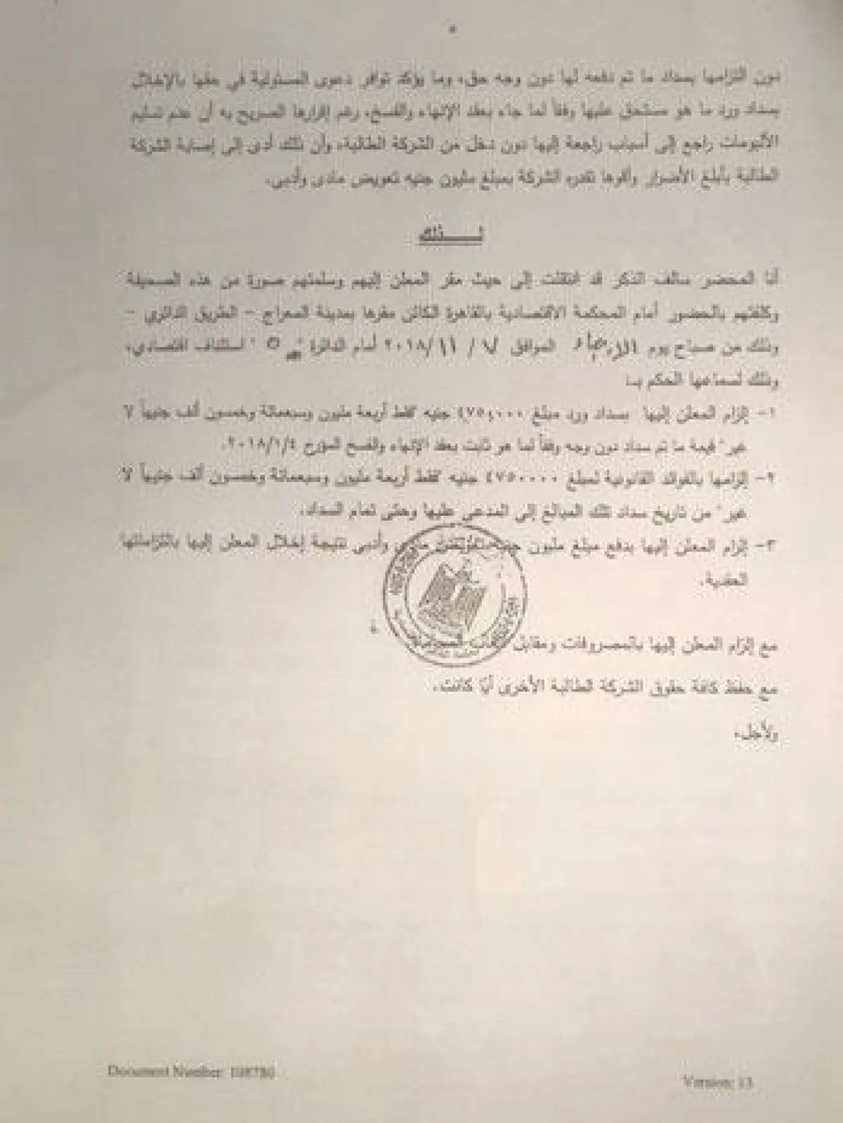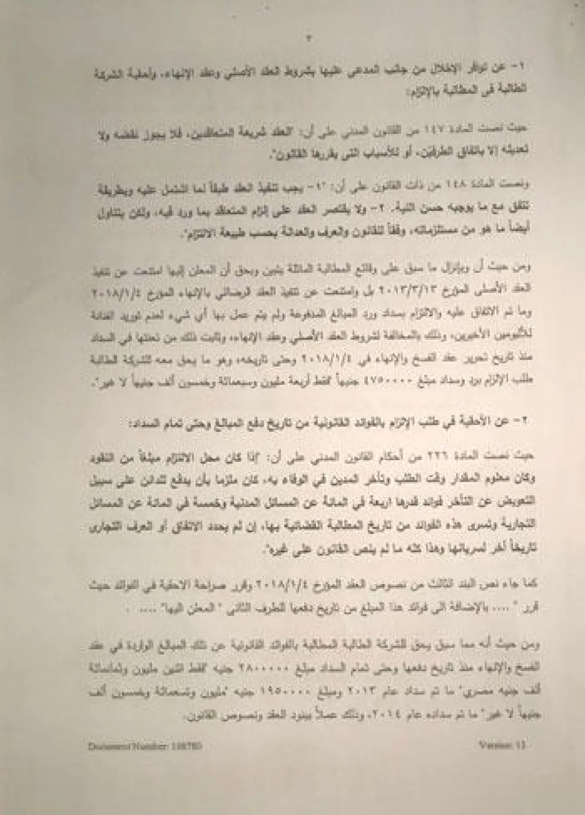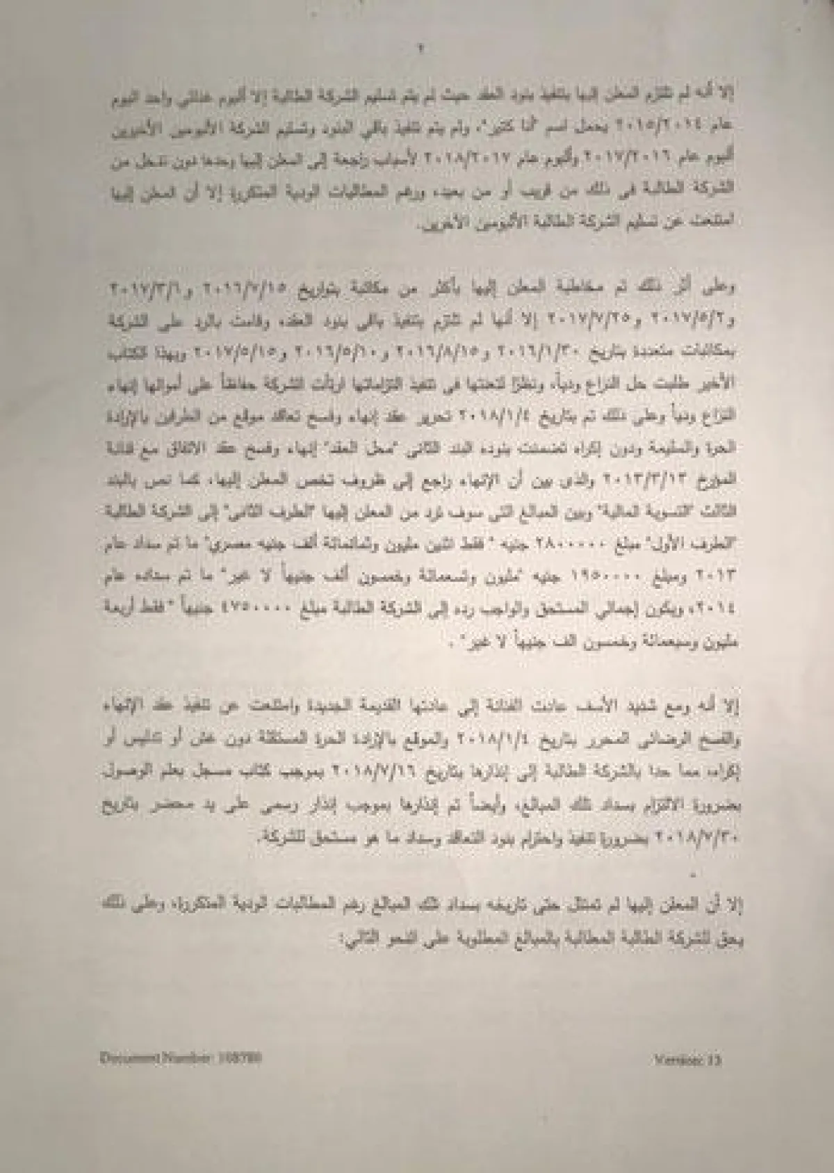 وتابع: "على إثر ذلك تمت مخاطبة المطربة بأكثر من مكاتبة وبتواريخ معلنة إلا أنها لم تلتزم باقي بنود العقد، وقامت بالرد على مخاطبات الشركة بمكاتبات متعددة بتاريخ، وقامت بالرد على مخاطبات الشركة بمكاتبات بأنها تريد حل النزاع وديًا، لكنها لم تلتزم أيضا، ونظرا لتعنتها فى تنفيذ التزاماتها ارتأت الشركة حفاظًا على أموالها إنهاء التعاقد وديًا وتم ذلك بتاريخ 4 يناير من العام الجارى2018، وتحرر عقد جديد وهو إنهاء وفسخ تعاقد موقع من الطرفين بالإرادة الحرة والسليمة ودون إكراه تضمنت بنوده البند الثانى "محل العقد" وإنهاء وفسخ عقد الاتفاق مع فنانة المؤرخ فى 13 مارس عام 2013، والذى بين أن الإنهاء راجع إلى ظرف تخص المعلن إليها، كما نص بالبند الثالث التسوية المالية بالمبالغ المستحقة والتى وصلت إلى 4 ملايين و750 ألف جنيه فقط لا غير".