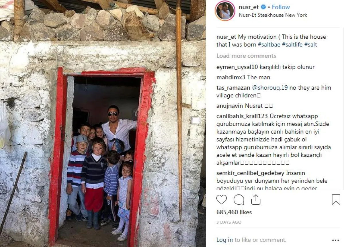 لا يتوقف الطاهي التركي الشهير «نصرت غوكشيه»، المعروف عالمياً بحركة «رشّ الملح»، عن تصدر عناوين وسائل الإعلام بين فترة وأخرى، إلا أنه هذه المرة لم يكن عبر أطباقه الشهية أو طريقته الغريبة في الطهي وتقطيع اللحم التي جبلت له كل هذه الشهرة، بل بسبب وفائه في العودة إلى جذوره، حيث نشر «حبيب الملح» كما يسمونه، يوم الخميس الماضي 18 تشرين الأول / أكتوبر 2018، صورة للمنزل البسيط الذي وُلد فيه، وعلق على الصورة قائلاً: «أمر محفز، هنا المنزل الذي وُلدت فيه».