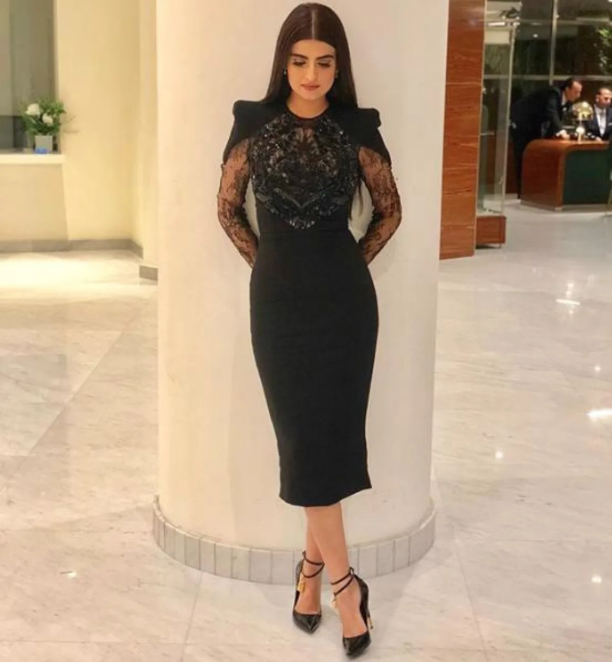 علا الفارس اختارت فستان ميدي باللون الأسود من “زهير مراد” Zuhair Murad مزيّنًا بطبقة من الدانتيل من الأعلى، وقصته ضيّقة بطول يصل أسفل حدّ الركبة، وقد اختارت معه حذاءً من الجلد باللون الأسود من “توم فورد” Tom Ford.