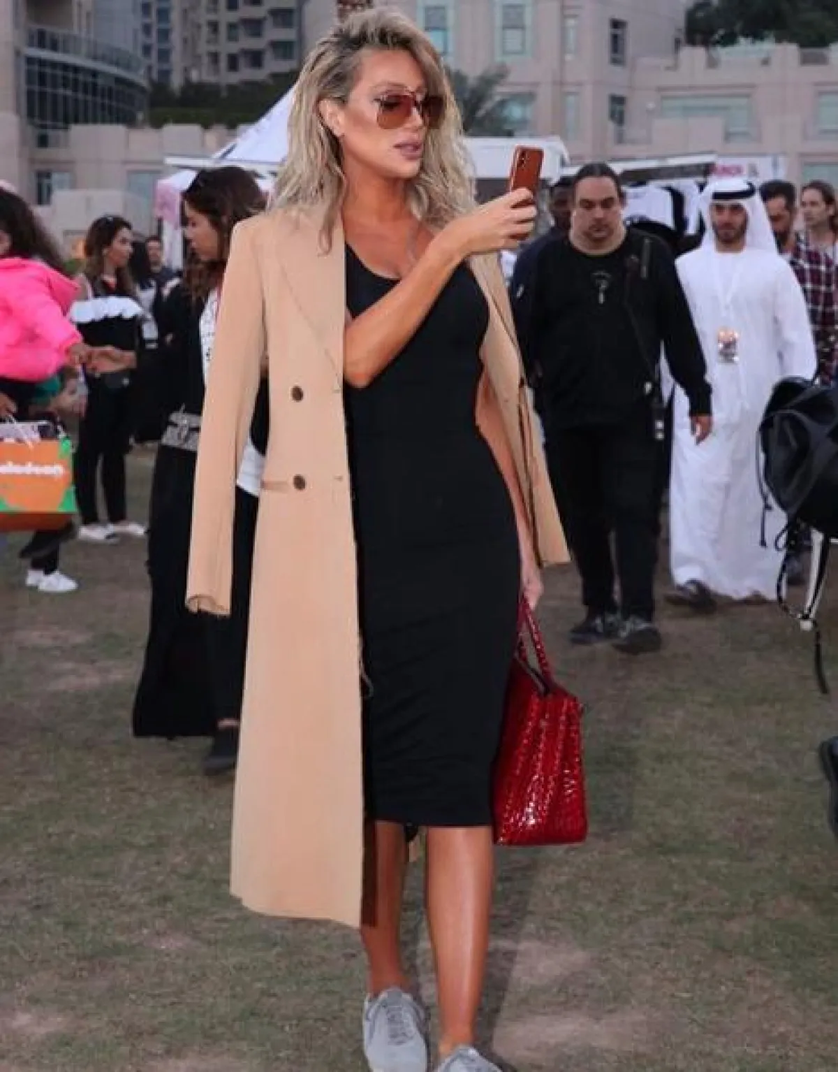 اختارت مايا دياب الفستان الأسود الميدي الكلاسيكي، ونسقته بطريقة شبابية عصرية، حيث اختارت معه معطفًا طويلًا باللون البيج، وحذاءً رياضيًّا باللون الرمادي، وشنطة يد من الجلد باللون الأحمر، واختارت نظارات شمسية أكملت بها الاطلالة.