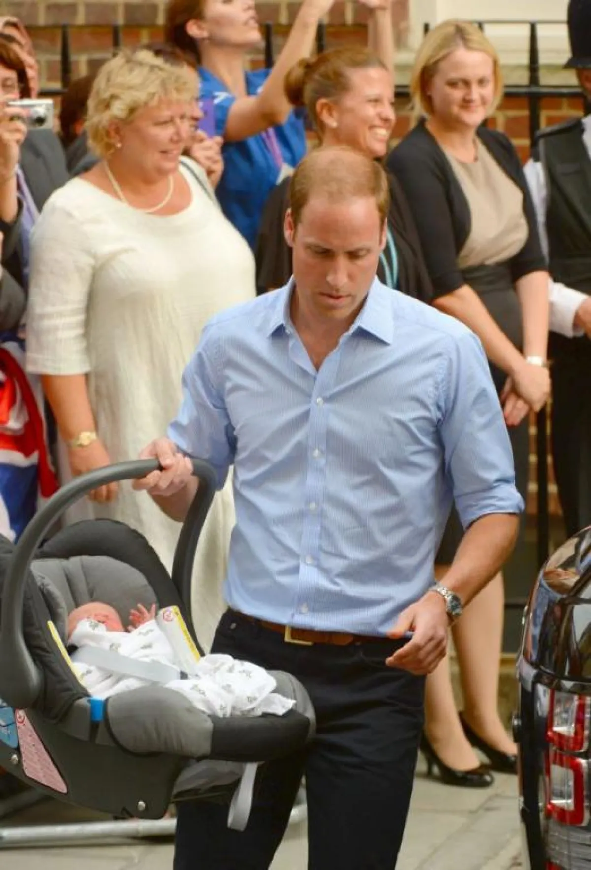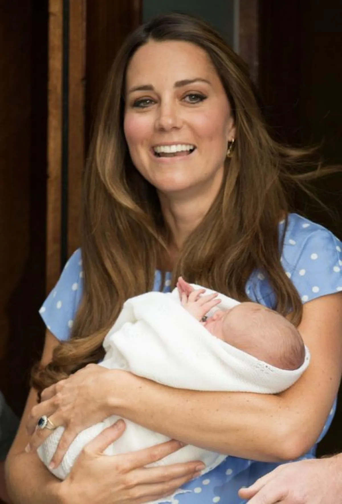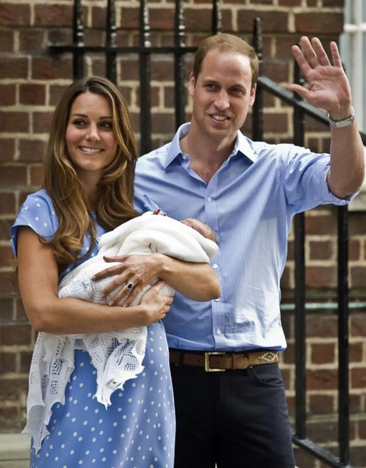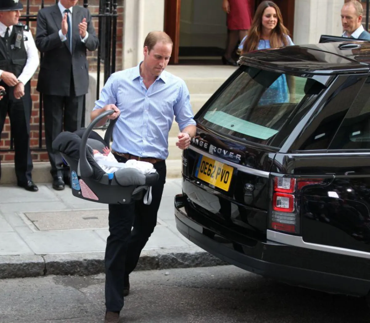 أخيراً أطل المولود الملكي على وسائل الإعلام بعد طول ترقب وانتظار، بعد أن خرجت دوقة كامبريدج الأميرة كيت ميدلتون من مستشفى سانت ماري في بادنغتون بالعاصمة البريطانية لندن وهي تحتضن وليدها الجديد، وبجانبها زوجها الأمير ويليام، وبدت دوقة كامبريدج، سعيدة للغاية وبصحة جيدة، ولوحت للجماهير، التي كانت بانتظارهما وهي تحمل وليدها قبل أن يحتضنه والده الذي بدا بدوره سعيداً وهو يجيب على أسئلة الصحفيين. وتحية للأمير الجديد أطلقت المدفعية في حديقة غرين بارك 41 طلقة، كما أطلقت 62 طلقة من برج لندن الأثري.