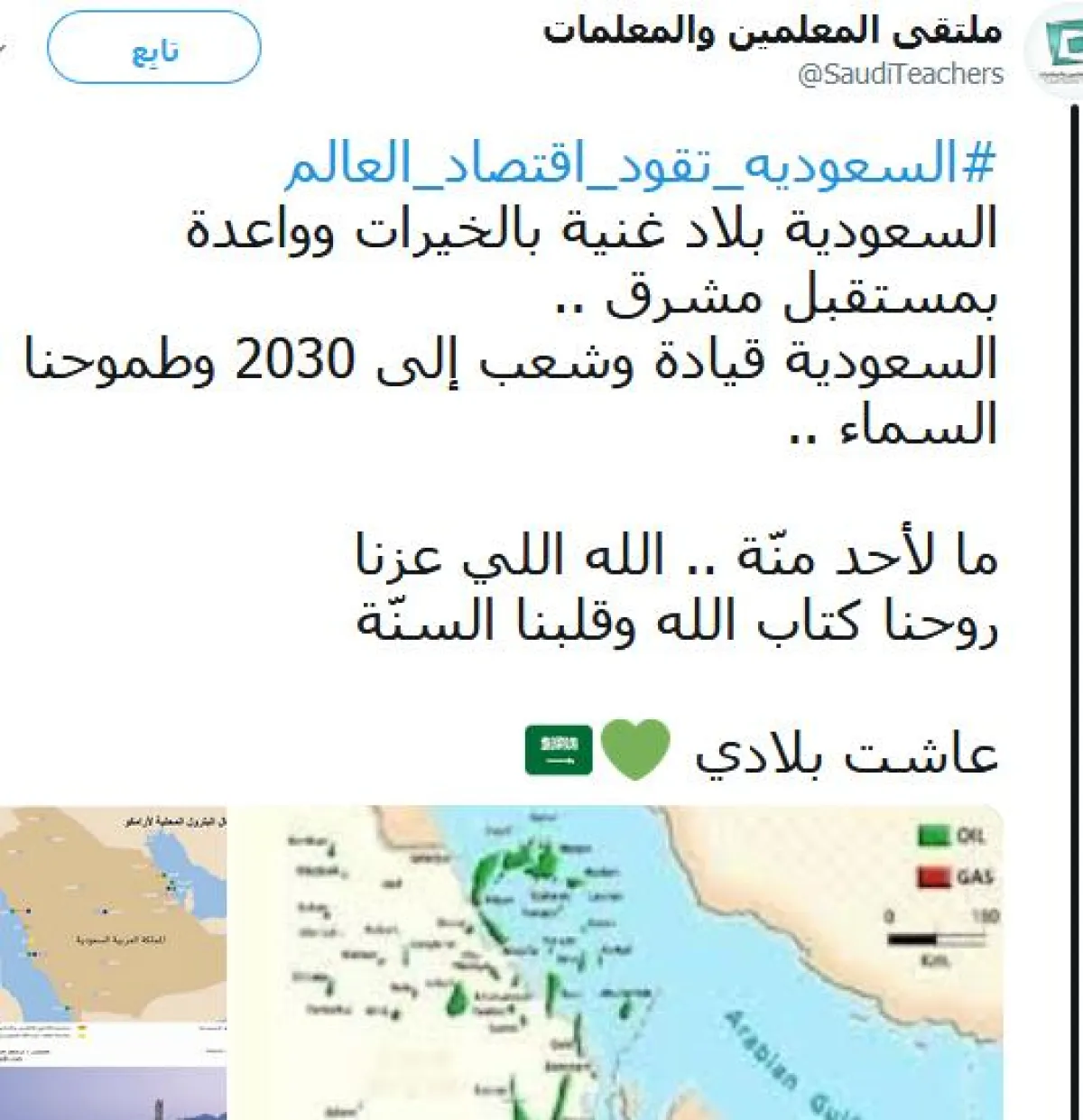وقال حساب ملتقى المعلمين والمعلمات: "السعودية بلاد غنية بالخيرات، وواعدة بمستقبل مشرق. السعودية قيادة وشعباً إلى 2030، وطموحنا السماء، ما لأحد منَّة علينا، الله الذي عزَّنا. روحنا كتاب الله وقلبنا السنّة".