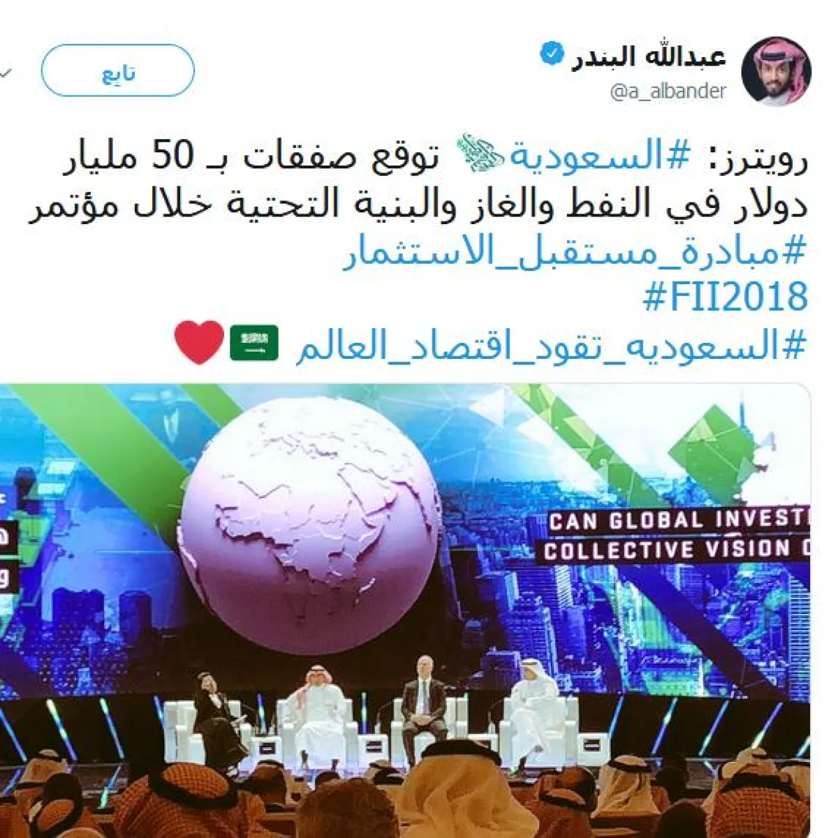 فيما غرد عبدالله البندر: "رويترز: #السعودية توقع صفقات بـ 50 مليار دولار في النفط والغاز والبنية التحتية خلال مؤتمر #مبادرة_مستقبل_الاستثمار الآن".