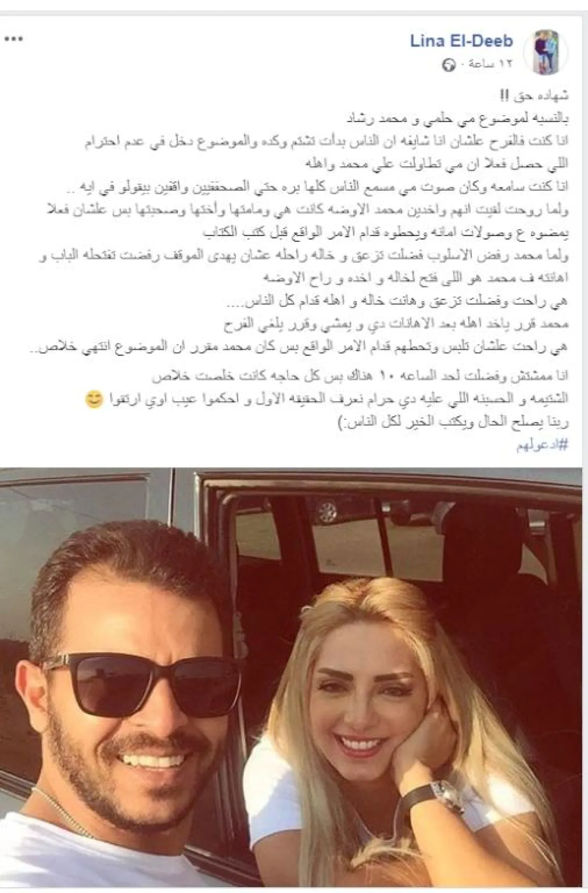لينا الديب نشرت صورة للعروسين محمد رشاد ومي حلمي عبر حسابها الشخصي بموقع الفيس بوك، وعلقت عليها قائلة: شهادة حق بالنسبة لموضوع مي حلمي ومحمد رشاد، أنا كنت بالفرح علشان أنا شايفة إنّ الناس بدأت تشتم وكده، والموضوع دخل في عدم احترام.
