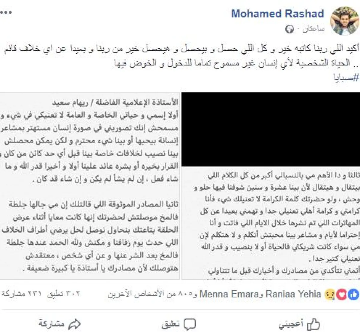 يُذكر أنّ محمد رشاد اعترف فجر اليوم أنّ كرامته وكرامة أسرته تعرضت للإهانة، ولكنه رفض ذكر التفاصيل، مؤكدًا أنه ناقش مع خطيبته مي حلمي الطرق الممكنة لترضية المتضررين من الخلاف.