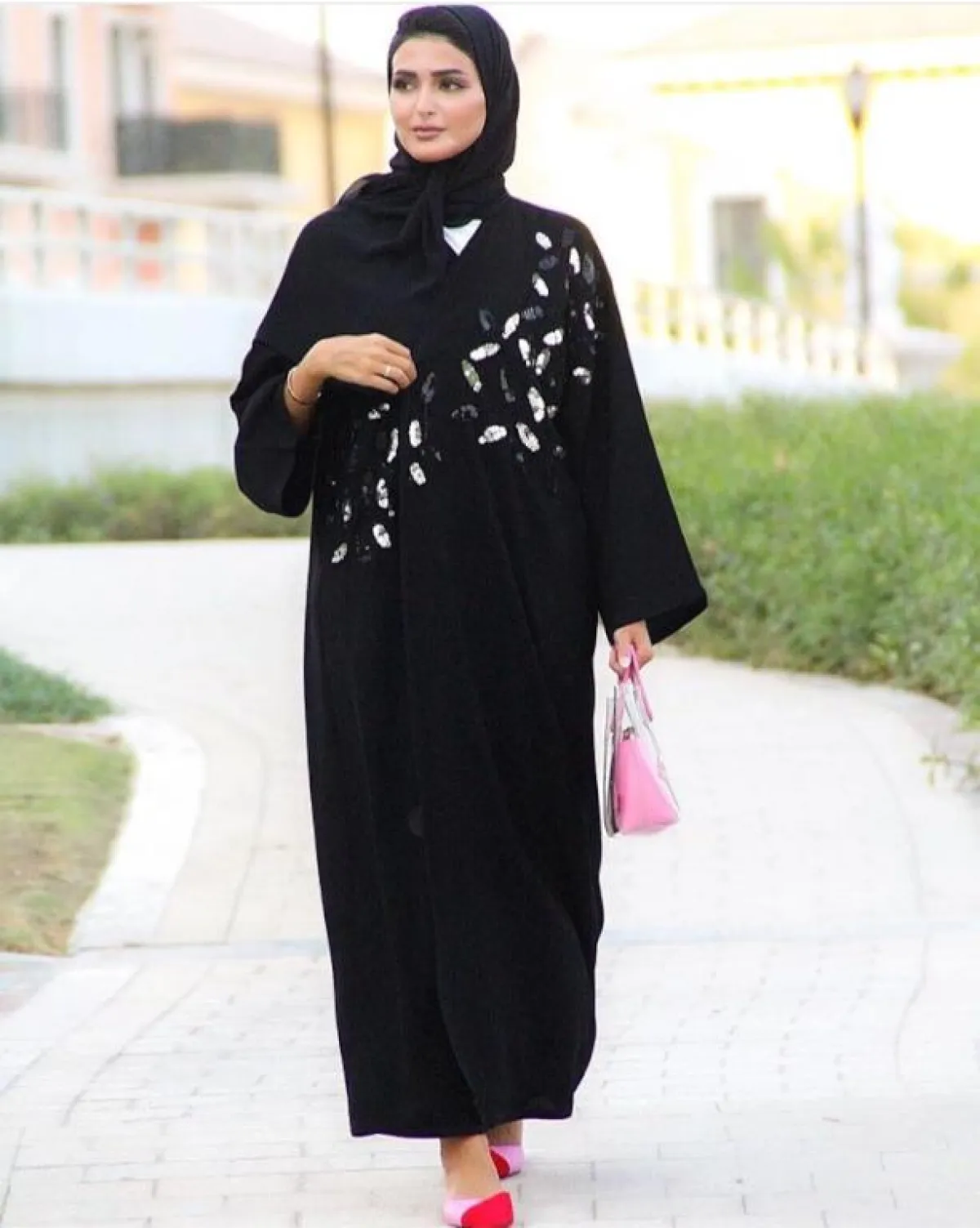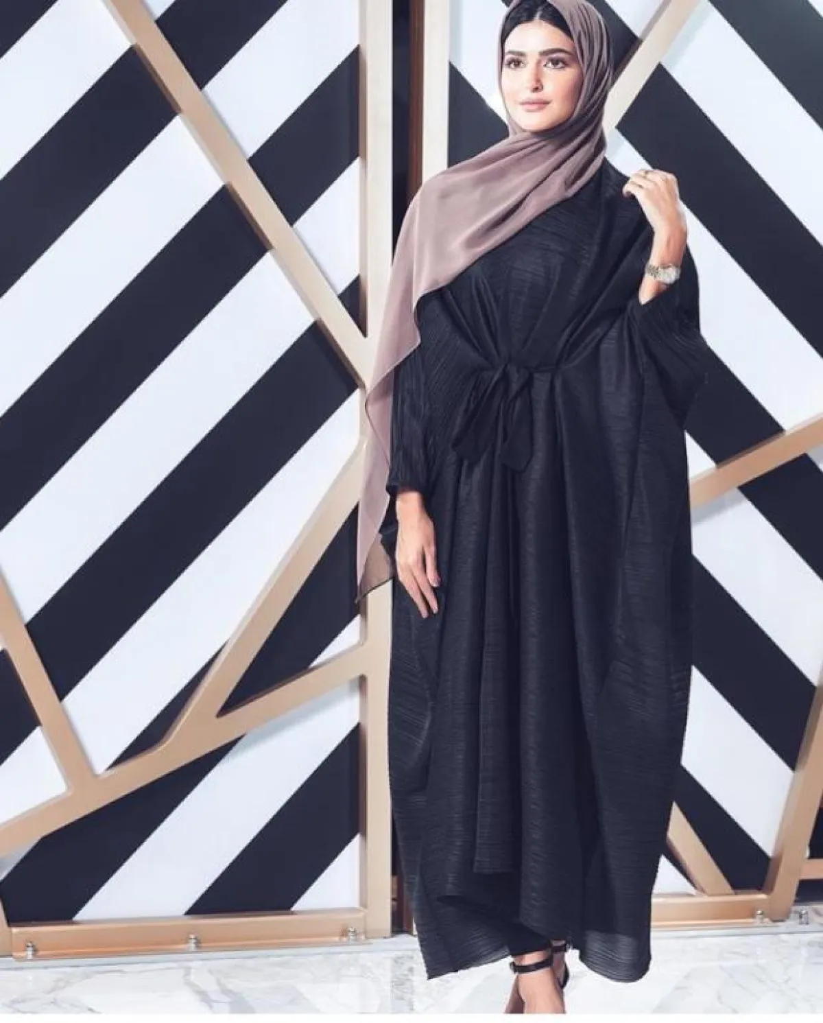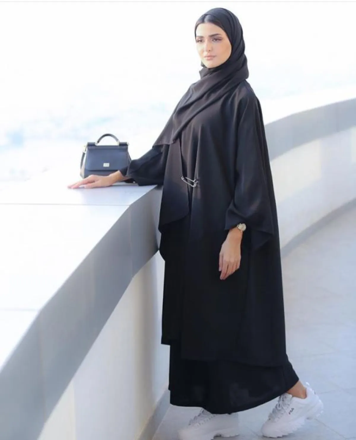 العبايات الواسعة عند الأكمام، يمكنكِ اعتمادها على طريقة حنين الصيفي، والمميز بهذا الستايل من العبايات، أنه يناسب كثيرًا من أجساد الصبايا، بخاصة البدينات، والأفضل مع هذا التصميم أن تعتمدي حذاءً وشنطة أنيقان وبسيطان، حتى لا يبدو مظهركِ متكلفًا للغاية مع موديل العباية الواسع، وقد أعجبنا لون الطرحة النيود البينك الداكنة التي نسقتها مع هذا التصميم من العباية.