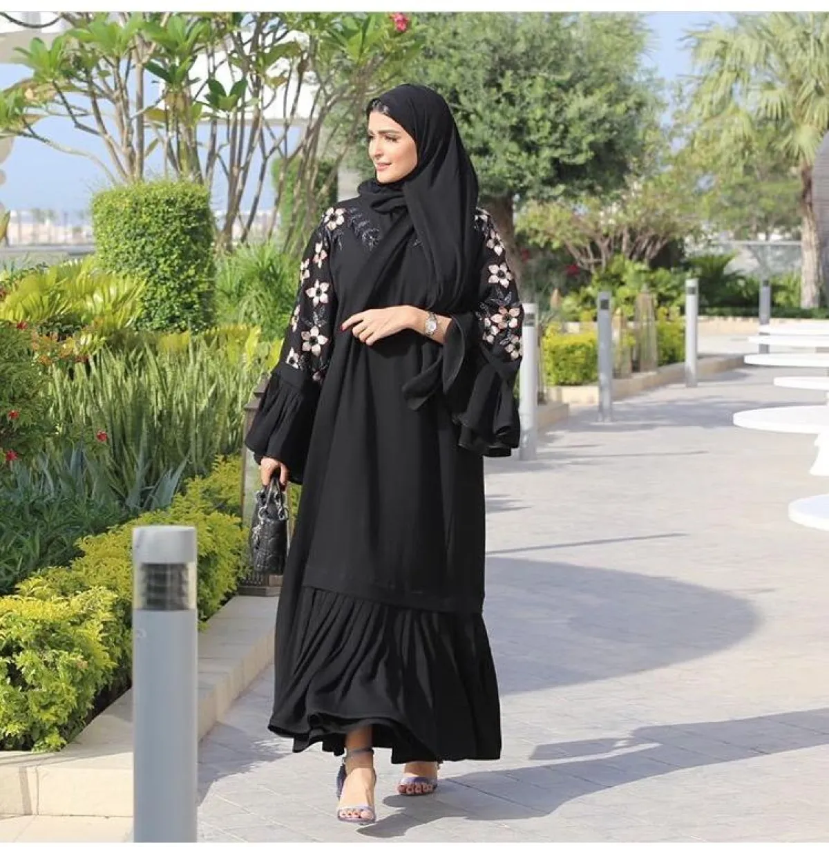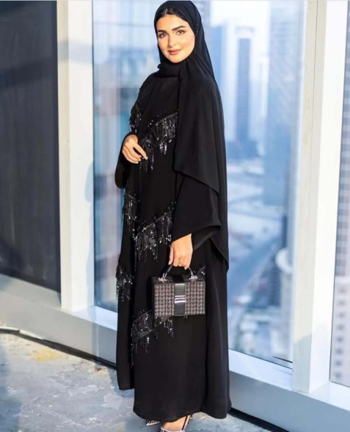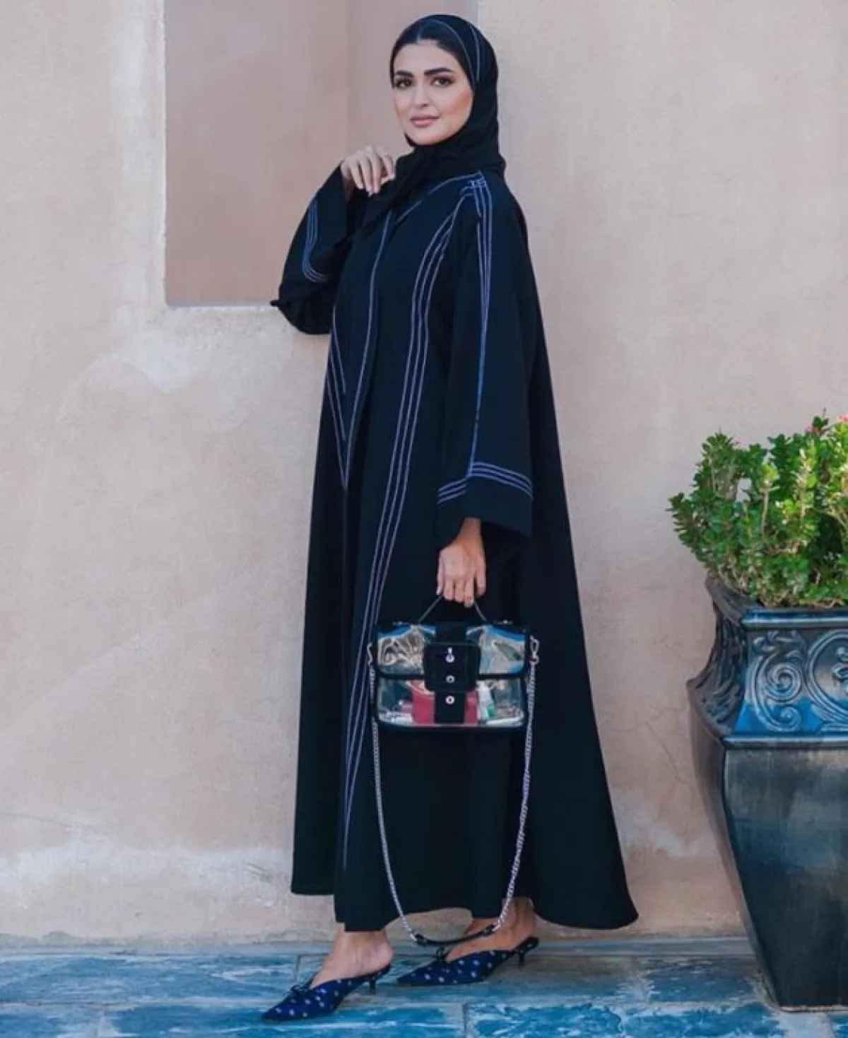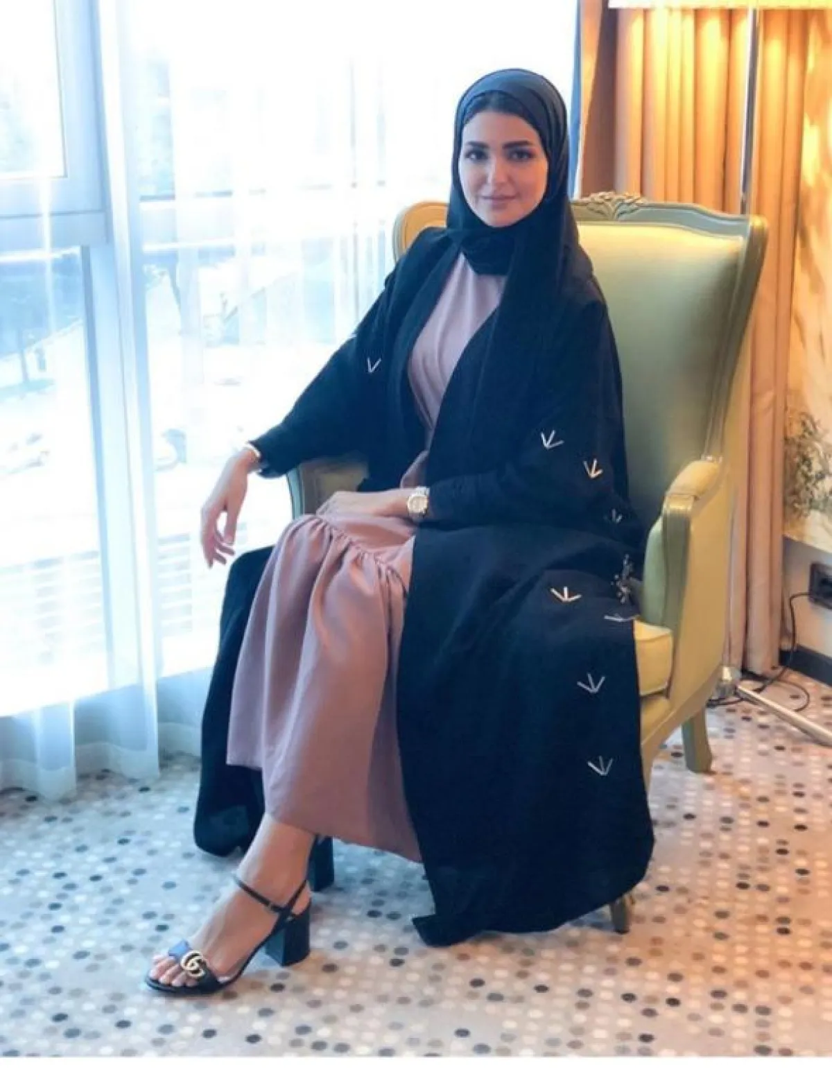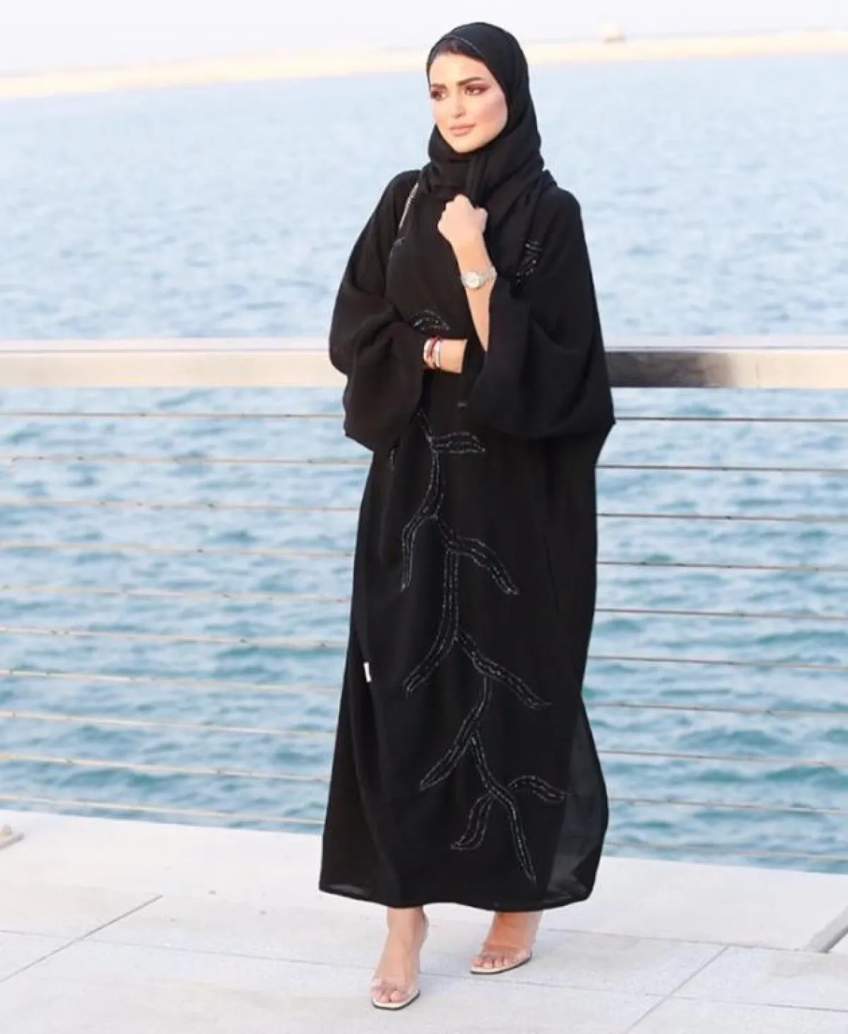 لمناسباتكِ الكلاسيكية سيلفت انتباهكِ العبايه السوداء المطرزة باللون نفسه، بشكل مهندم وبراق، كالاطلالة من حنين بالتطاريز على الأكتاف، نسقت معها شنطة صغيرة سوداء، وحذاءً من الستان بكعب رفيع باللون نفسه، لاطلالة حيادية.