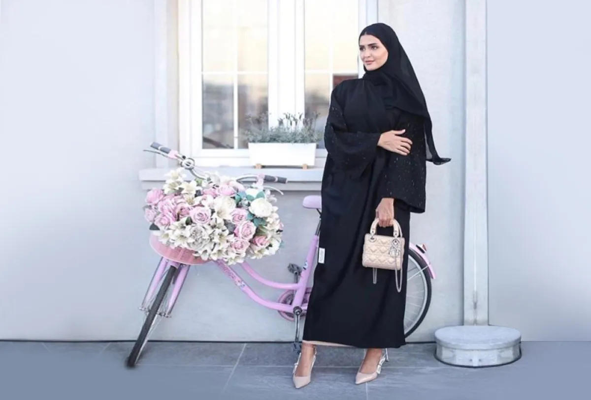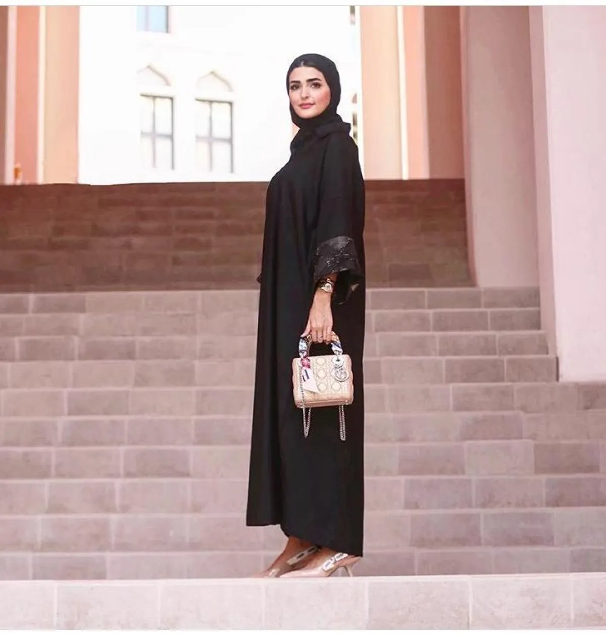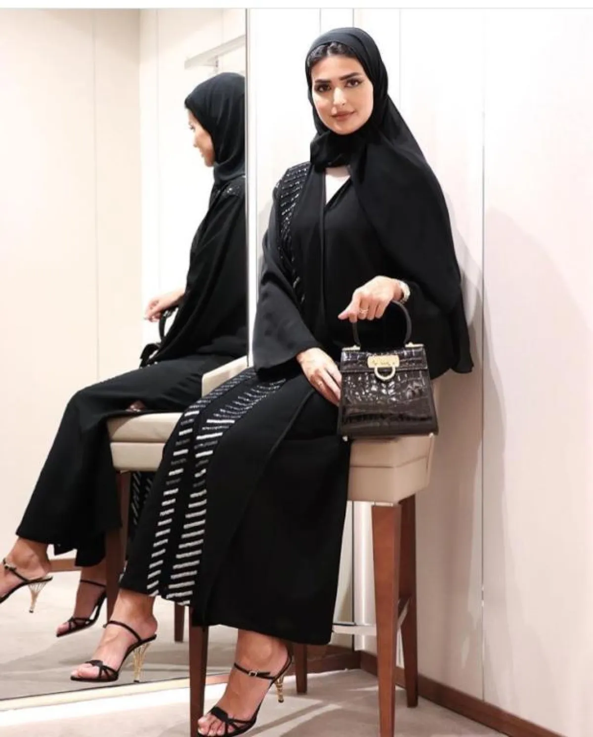 ولكنها في بعض الأحيان قد تغيّر هذه النظرة، كـ العباية النهارية البسيطة من دون أيّ تطريزات، فقط دبوس فضي يربط العباية من المنتصف، اختارت معها الحذاء الرياضي بـ كعب عالٍ سرّي، يضيف لها طولًا، مع شنطة ميني سوداء.
