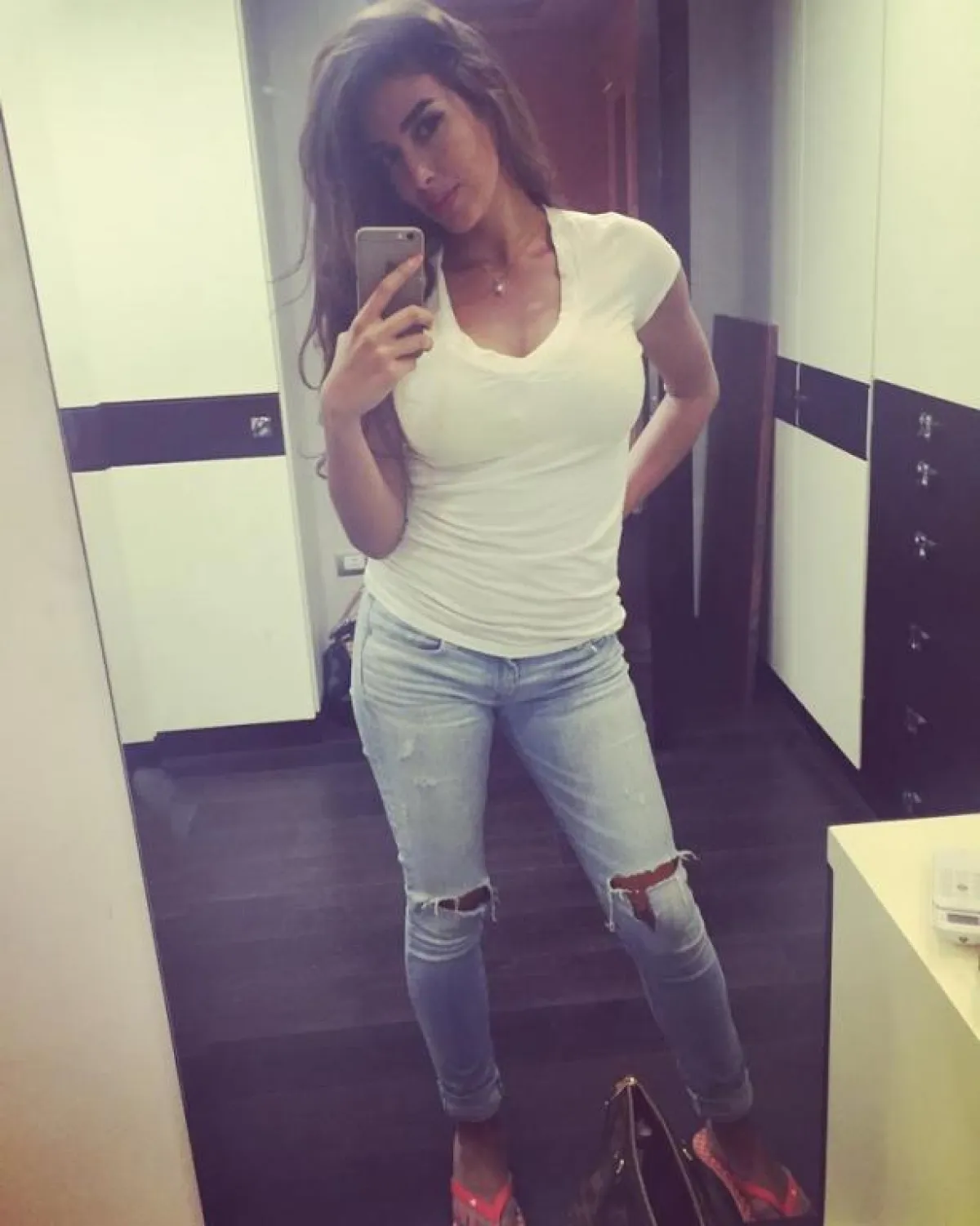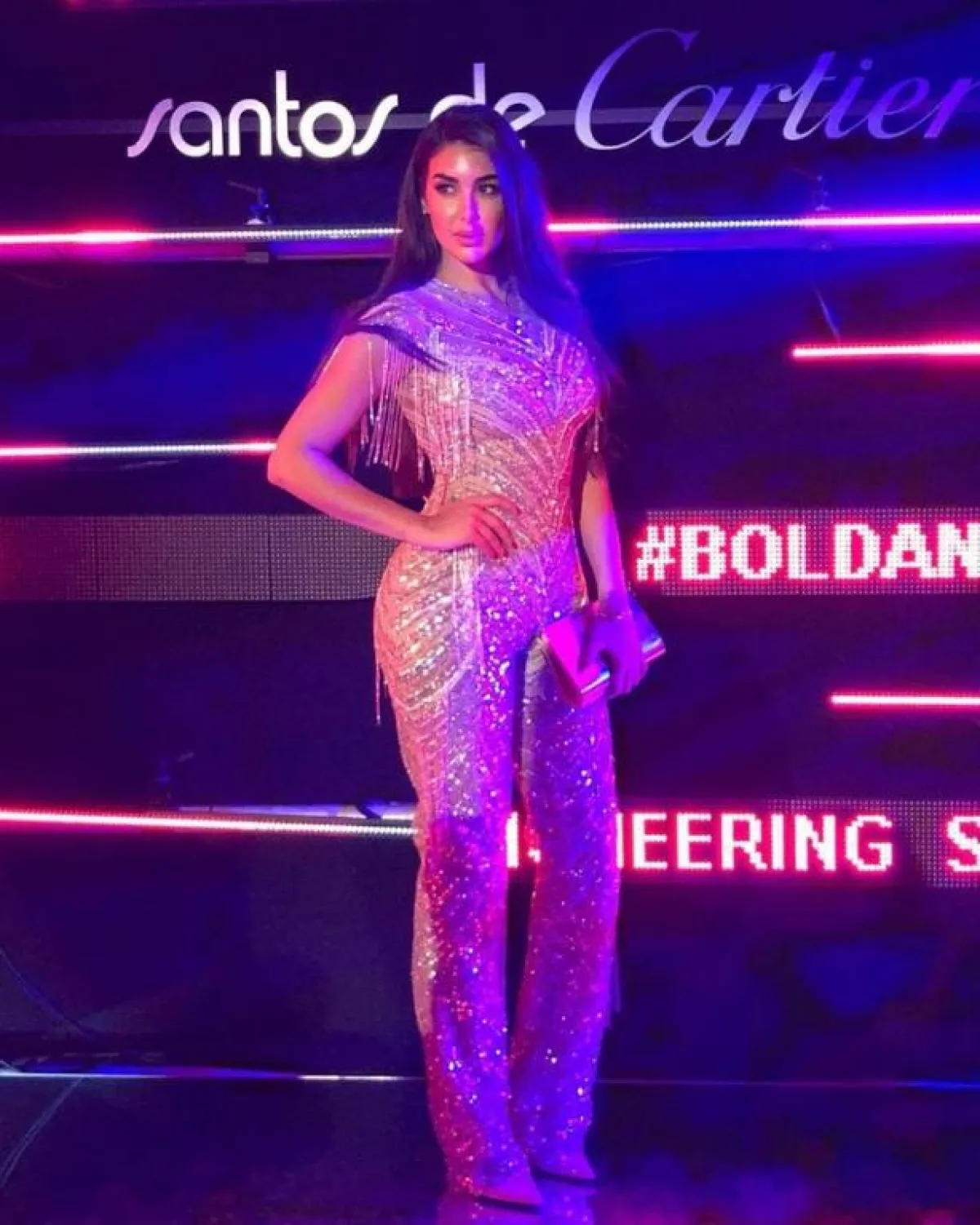 واعتمدت أيضاً على أسلوب أخر لتشتت الانتباه عن منطقة البطن، من خلال الأزياء القصيرة أو المزينة بشق الساق فهذا من شأنه يجذب الانتباه إلى ساقيها الممشقتين.