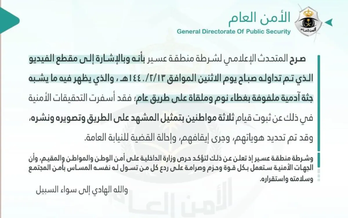 وفي التفاصيل، قال المتحدث الإعلامي باسم شرطة منطقة عسير: بالإشارة إلى مقطع فيديو تم تداوله الاثنين ١٤٤٠/٢/١٣هـ، ويظهر فيه ما يشبه جثة آدمية ملفوفة بغطاء نوم وملقاة على طريق عام، فقد أسفرت التحقيقات الأمنية عن ثبوت قيام ثلاثة مواطنين بتمثيل المشهد على الطريق، وتصويره بهيئة توحي بحقيقته، ونشره، وقد تم تحديد هوياتهم، وجرى إيقافهم، وإحالة القضية إلى النيابة العامة، وشرطة منطقة عسير إذ تعلن ذلك لتؤكد حرص وزارة الداخلية على أمن الوطن والمواطن والمقيم، وأن الجهات الأمنية ستعمل بكل قوة وحزم وصرامة على ردع كل مَن تسول له نفسه المساس بأمن المجتمع وسلامته واستقراره.