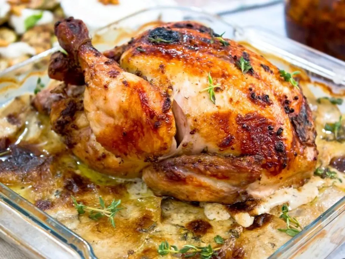 طريقة التحضير: 1 ـ قومي بتتبيل الدجاج أوّلاً. ابشري البصل، وامزجيه بالزبادي والخردل، ثمّ أضيفي الملح والفلفل والبهار. 2 ـ ادهني الدجاج جيّداً بهذا المزيج من الداخل والخارج، وضعيه داخل الفرن. 3 ـ بعدها، حضّري صينيّة البطاطس: قومي بتقطيع البطاطس إلى شرائح رفيعة، وتبّليها بالملح والفلفل والأوريغانو ومسحوق الثوم. 4 ـ أضيفي زيت الزيتون، وضعيها جانباً. 5 ـ قومي بقلي البصل مع الزيت والسكّر، ثمّ أضيفي الملح والفلفل، وانتظري حتّى يذبل ويأخذ اللون الذهبيّ. 6 ـ سخّني الكريما، مع المرق والبهارات. ضعي طبقة من البطاطس في صينيّة الفرن، ثمّ غطّيها بالبصل المكرمل، وأعيدي تغطية البصل بما تبقى من البطاطس. اسكبي الكريما بالصينيّة، ثم أدخلي القالب إلى الفرن لمدّة 40 دقيقة.