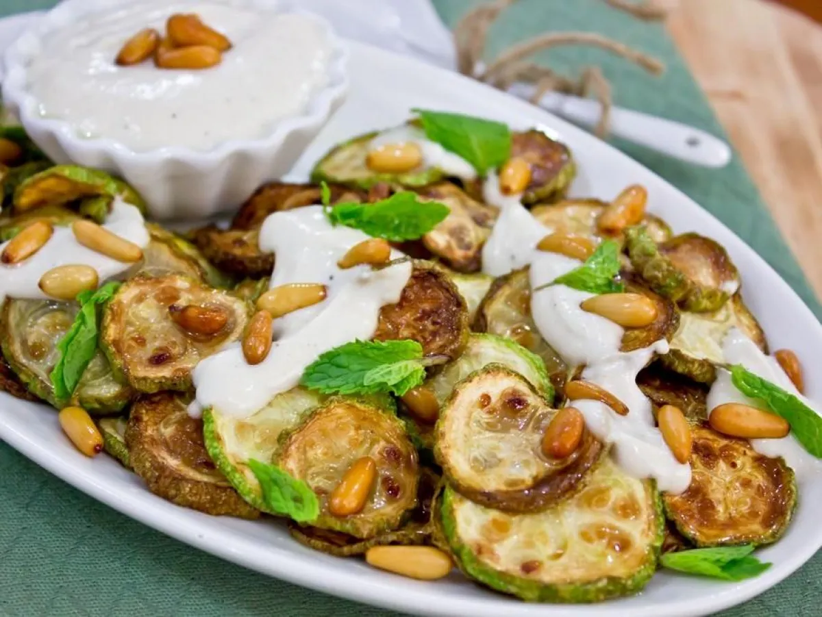 5- ضعي شرائح الكوسة المقليّة في صحن التقديم، ثمّ اسكبي فوقها الصلصة المحضّرة بشكل جميل. واختمي العمل بنزيين الطبق بأوراق النعناع وحبات الصنوبر.