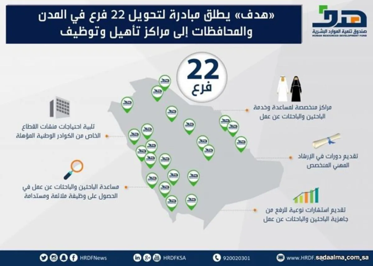 أعلن صندوق تنمية الموارد البشرية (هدف)، عن إطلاق مبادرة لتحويل فروعه الـ 22 في المدن والمحافظات إلى مراكز تأهيل وتوظيف للباحثين والباحثات عن عمل، ومتابعة استقرارهم الوظيفي، وتقديم الدعم لأصحاب الأعمال لتوطين الوظائف المنتجة والمستقرة.