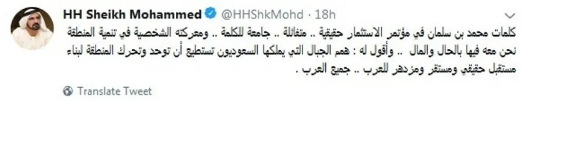 لقيت كلمة ولي العهد الأمير محمد بن سلمان التي ألقاها يوم أمس في مؤتمر مبادرة مستقبل الاستثمار إعجاب واهتمام كل الحاضرين، وتناقلتها وسائل الإعلام ومواقع التواصل الاجتماعي بصورة كبيرة، وكان من ضمن المعلقين على الكلمة إعجابًا وإطراءً نائب رئيس دولة الإمارات، وحاكم دبي الشيخ "محمد بن راشد آل مكتوم"؛ حيث قال الشيخ "محمد" في تغريدة له عبر حسابه الرسمي بموقع التواصل الاجتماعي "تويتر":" كلمات ولي العهد الأمير محمد بن سلمان في مؤتمر الاستثمار حقيقية.. متفائلة.. جامعة للكلمة.. ومعركته الشخصية في تنمية المنطقة نحن معه فيها بالحال والمال".