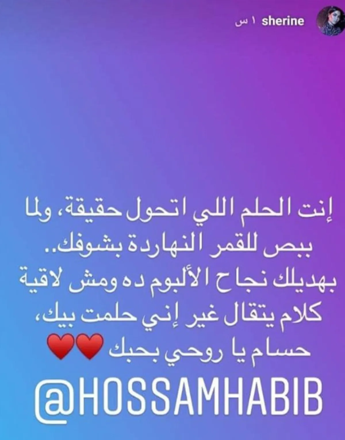 وجهت شيرين عبد الوهاب رسالة رومانسية جدًّا إلى زوجها الملحن والمطرب حسام حبيب، بعد نجاح ألبومها الجديد "نسّاي"، الذي خضع بالكامل لإشرافه الفني، وأكدت فيها أنّ حسام كان "حلمًا" وتحوّل إلى حقيقة، وأهدت له نجاح الألبوم.