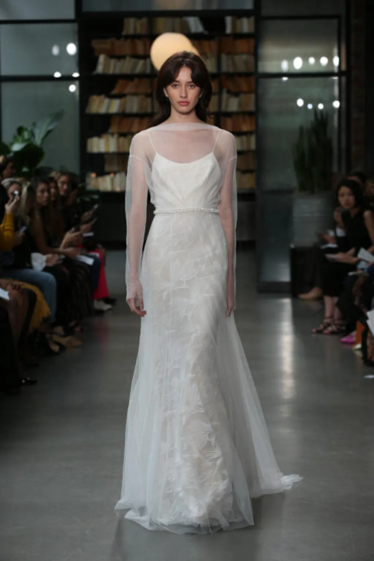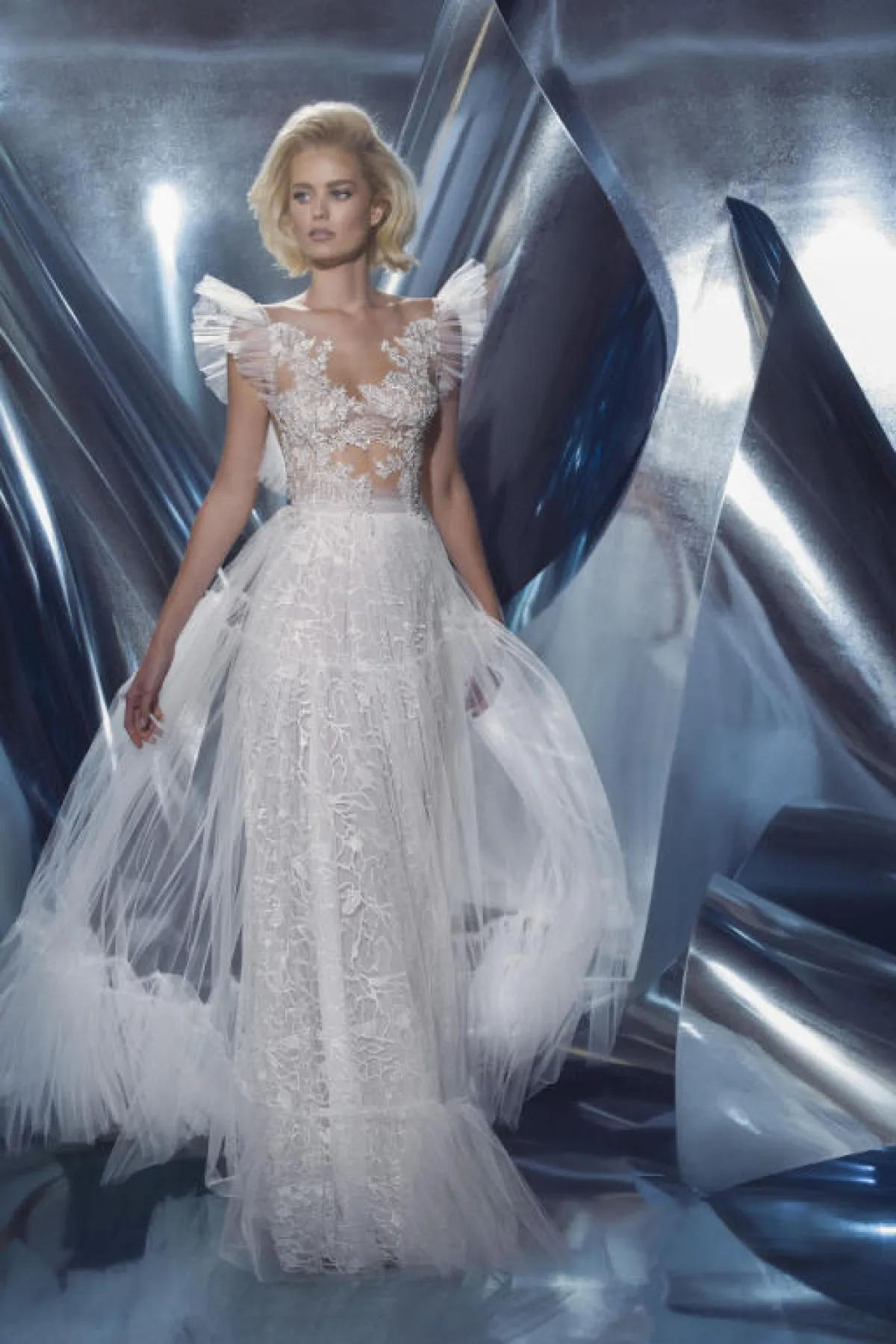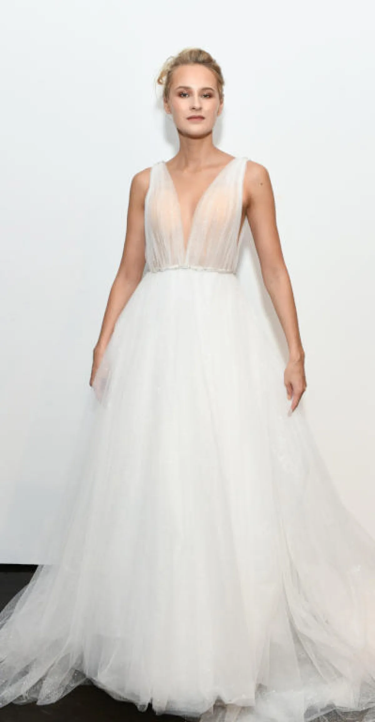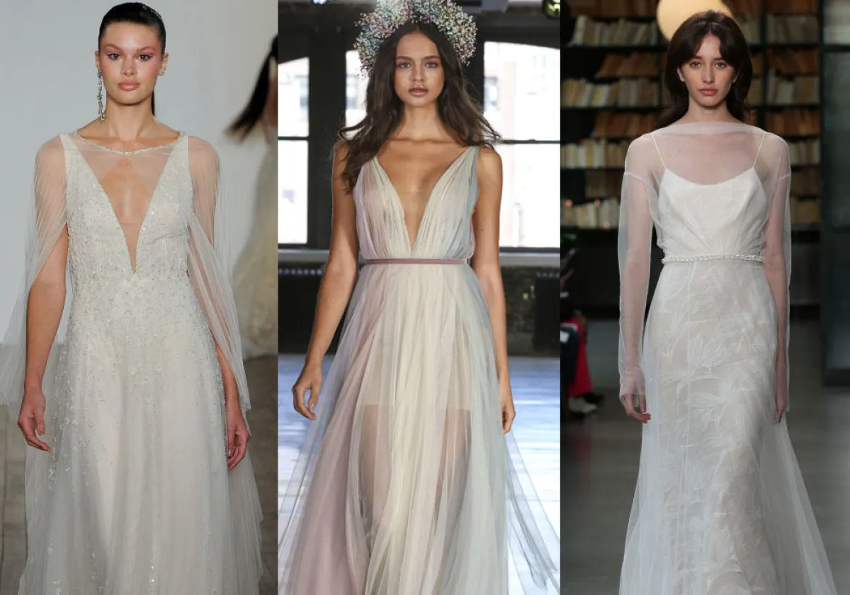 كما قدمت بعض الماركات فساتين زفاف تول ناعمة دون أي تفاصيل لافتة، مثل فستان زفاف Chantal Romano، وفساتين زفاف Willowby by Watters.