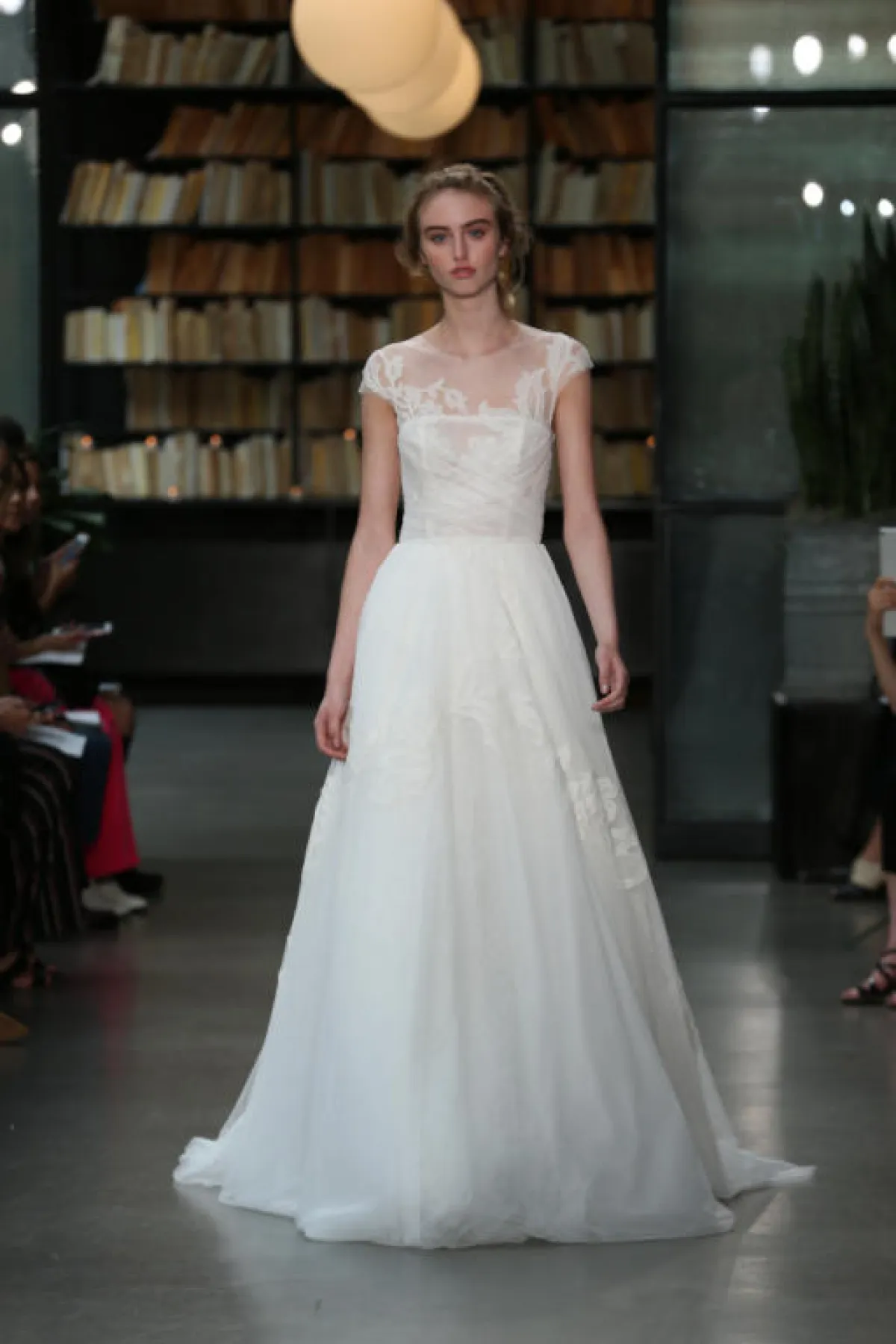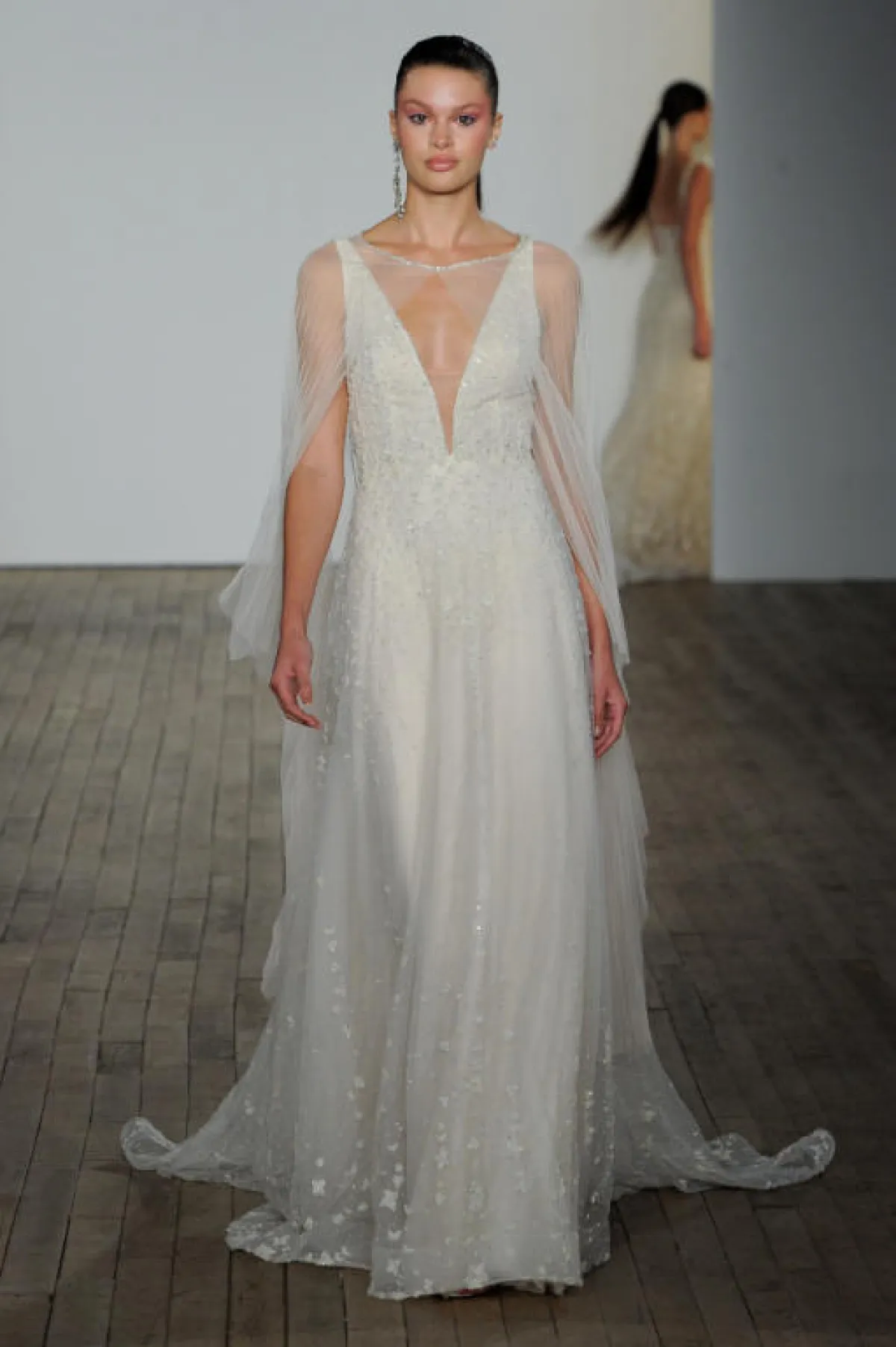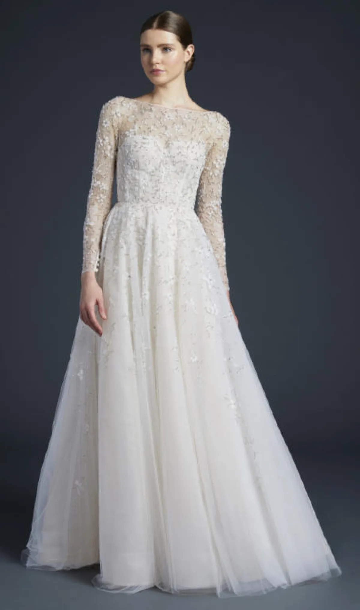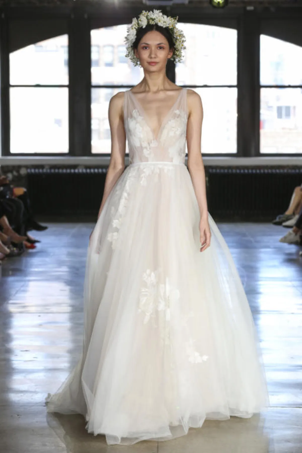 كما قدمت بعض الماركات فساتين زفاف تول ناعمة دون أي تفاصيل لافتة، مثل فستان زفاف Chantal Romano، وفساتين زفاف Willowby by Watters.