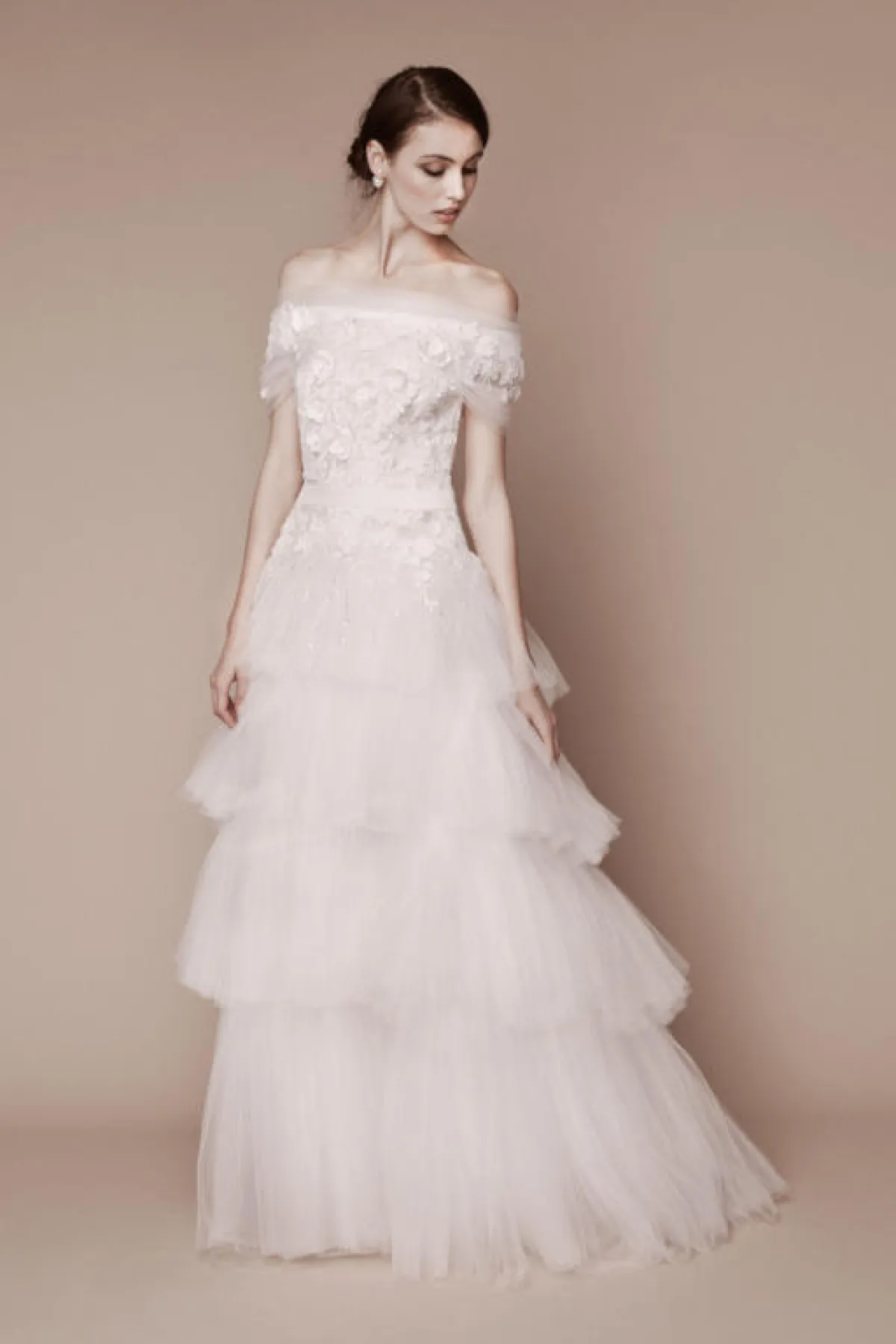 أما دار ماركيزا Marchesa، فصممت فستان تول بطبقات متدرجة الأطوال في التنورة، مع قصّة كاشفة للأكتاف Off Shoulder، وتميز التصميم بالنعومة والبساطة.