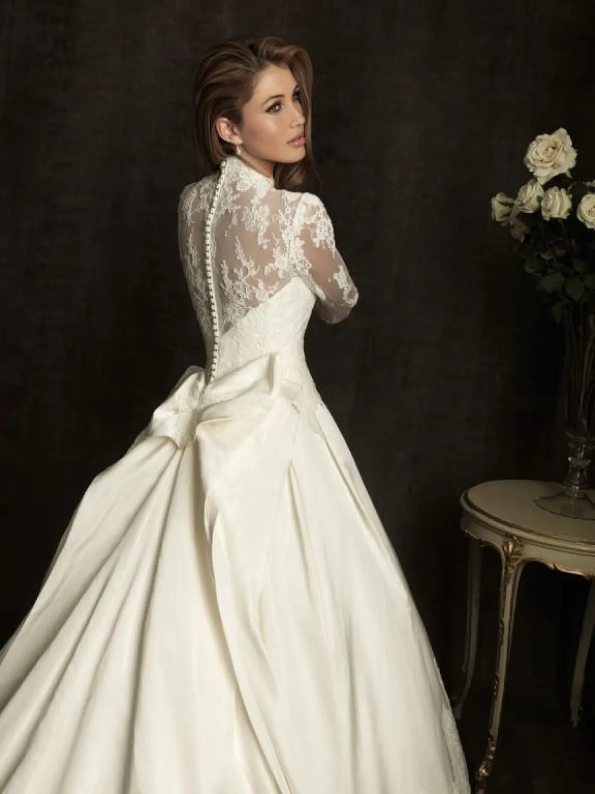 يمكنكِ اختيار فتحة الظهر على شكل V حتى يبدو ظهركِ أطول وأكثر نحافة، للصبيّة صاحبة الوزن المتوسط، مع رسومات الدانتيل البارزة، وهنا ستعتمدين على طرحة بطبقة خفيفة حتى لا تخفي جمال الفستان من الخلف.