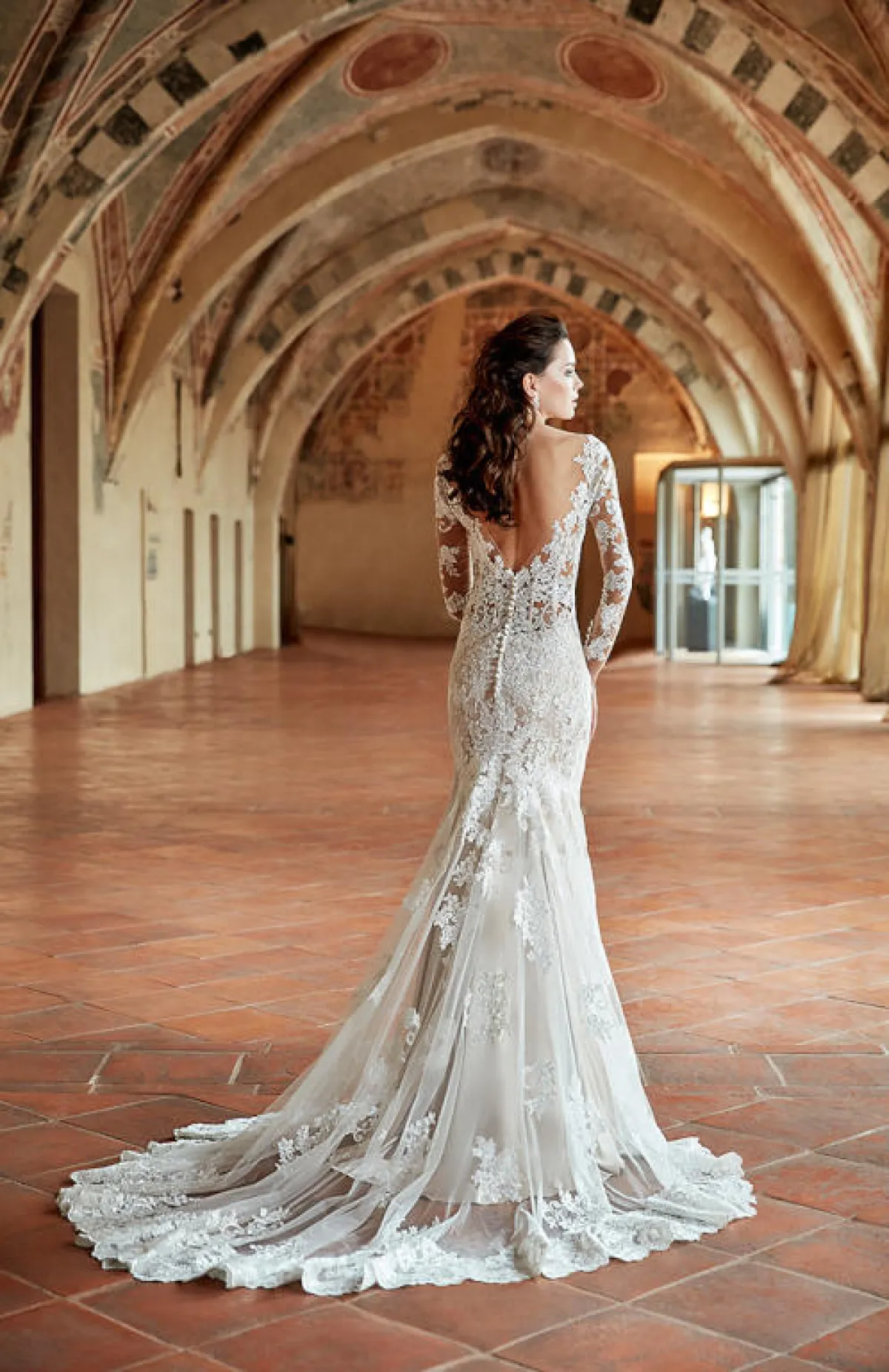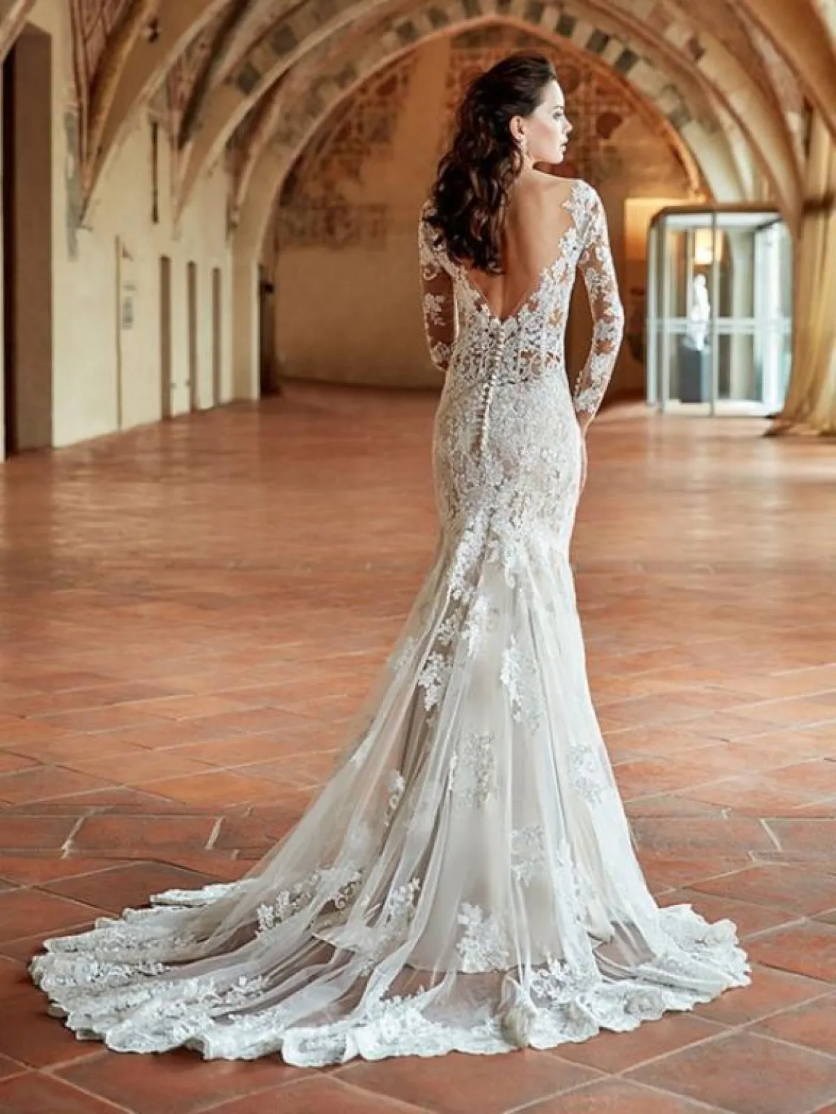 الفساتين المطرزة بـ الدانتيل بشكل كامل من الخلف، مع أزرار في المنتصف، هي الأشهر في ما يتعلق بتصاميم فساتين الظهر للـ زفاف، بخاصة وأنها تمنح المرأة شكلًا لطيفًا لجسدها، وعادة ما تكون الفساتين بتصميم حورية البحر، أو الفساتين التايبست.