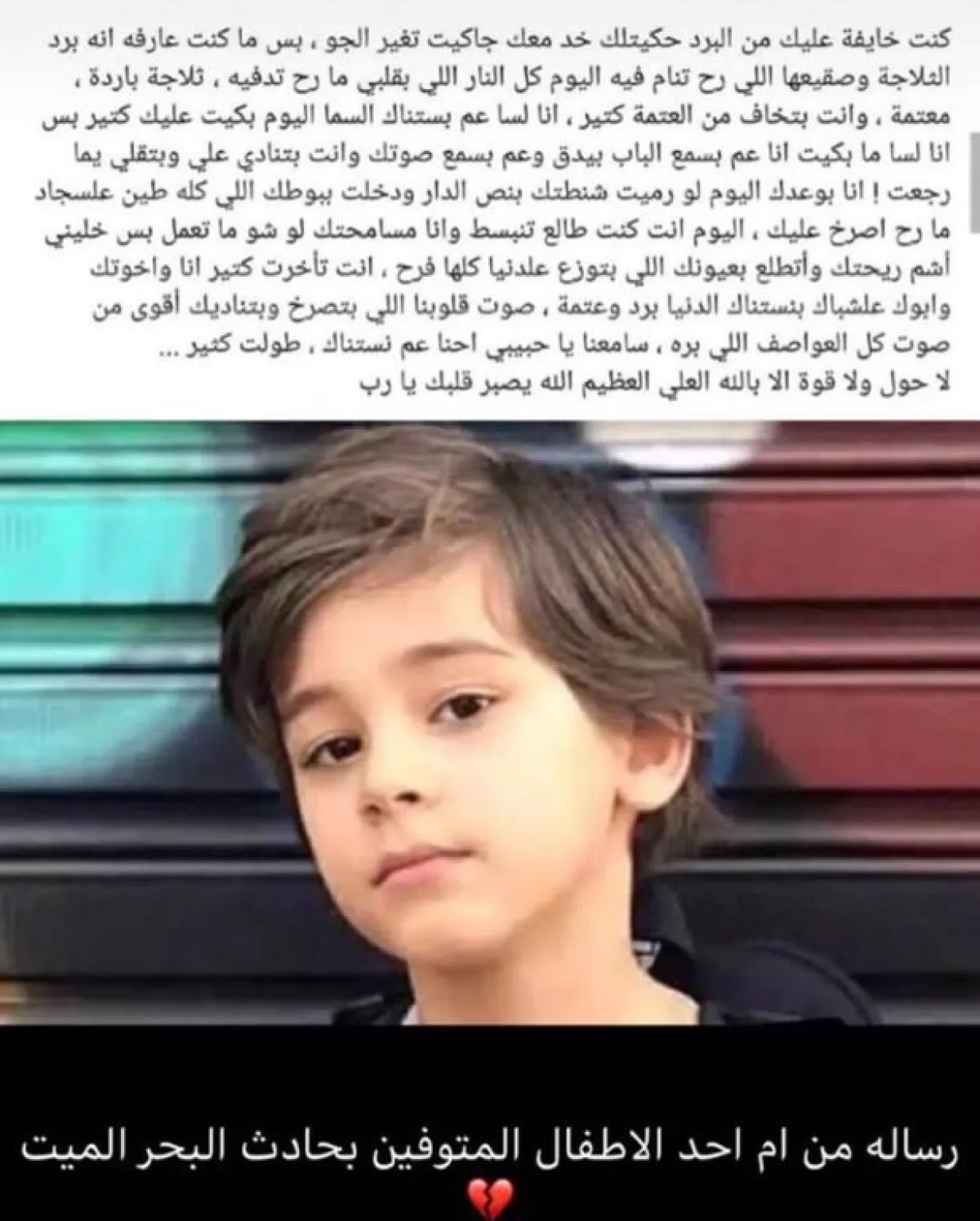 في خِضَم كل هذه الأحداث المأساوية التي تعيشها المملكة الأردنية الهاشمية، والفاجعة التي يعيشها الأردنيون هذه الأيام، يتداول رواد ونشطاء التواصل الاجتماعي، رسالة مؤثرة للغاية، إلى الحد التي وصفها العديد منهم بأنها «رسالة مُبكية»، لإحدى الأمهات التي فقدت ابنها في الأحداث الأخيرة في البحر الميت، والتي تعبر بشكل أقوى عن هوّل الحادث الجلل، من كل نشرات الأخبار وتصريحات المختصين.