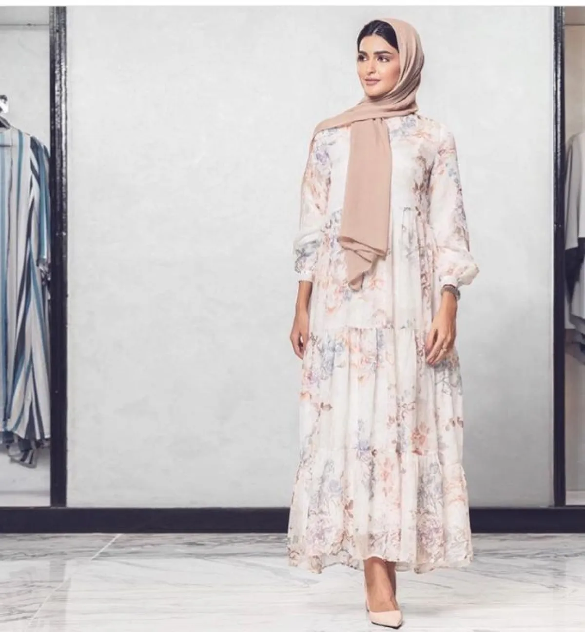 بينما اعتمدت المدونة القطرية حنين الصيفي على ألوان أكثر هدوءًا، لكنّ النقوش كذلك كانت هي الأساس في لون العبايه الفاتح، واختارت الحجاب النيود البيج، والحذاء من اللون نفسه ليضيف لمسة هادئة للوك.