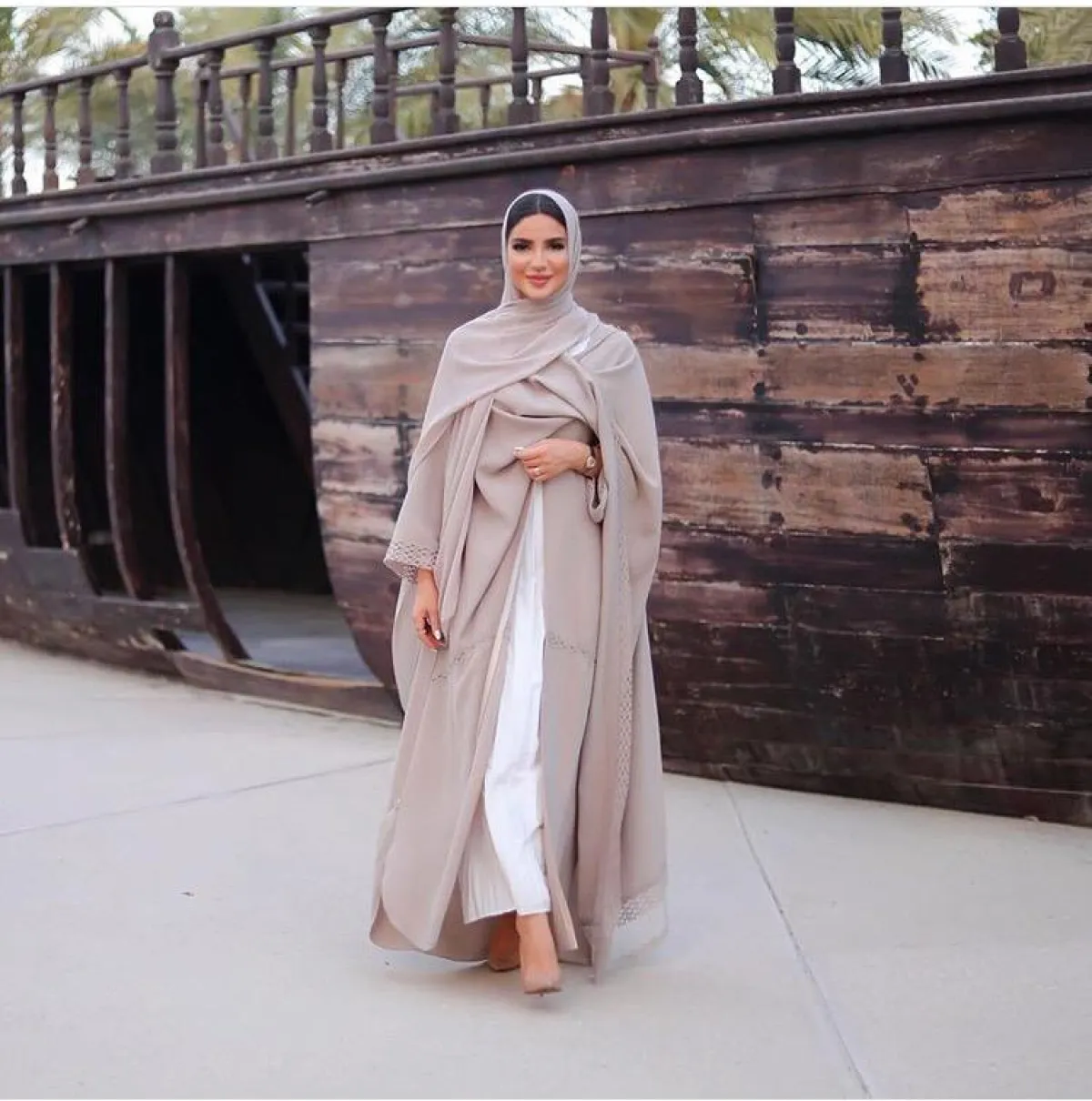 وبدرجات الألوان نفسها، لكن هذه المرة بستايل العبايه المفتوحة، اعتمدت الفاشينيستا فاطمة حسام على العباية باللون النيود البيج المخملي، وارتدته معه قطعة تحتية طويلة باللون الأبيض، لاطلالة كلها أنوثة للمرأة خلال النهار.