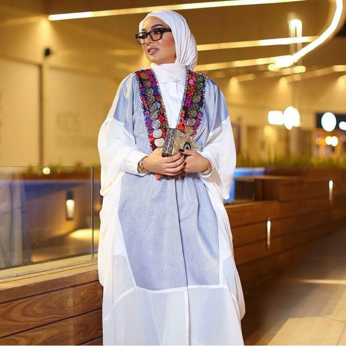 اختارت المدونة الكويتية جمال النجادة عباية ملونة بالكامل بالرسومات المتداخلة، بأكتاف واسعة ومهدولة تخطف الأنظار من النظرة الأولى، وقد نسقت معها توب أبيض لاطلالة محتشمة مع أكمام العباية القصيرة، وحجابًا باللون نفسه، وهو الدرجة المعتادة للمدونات الخليجيات.