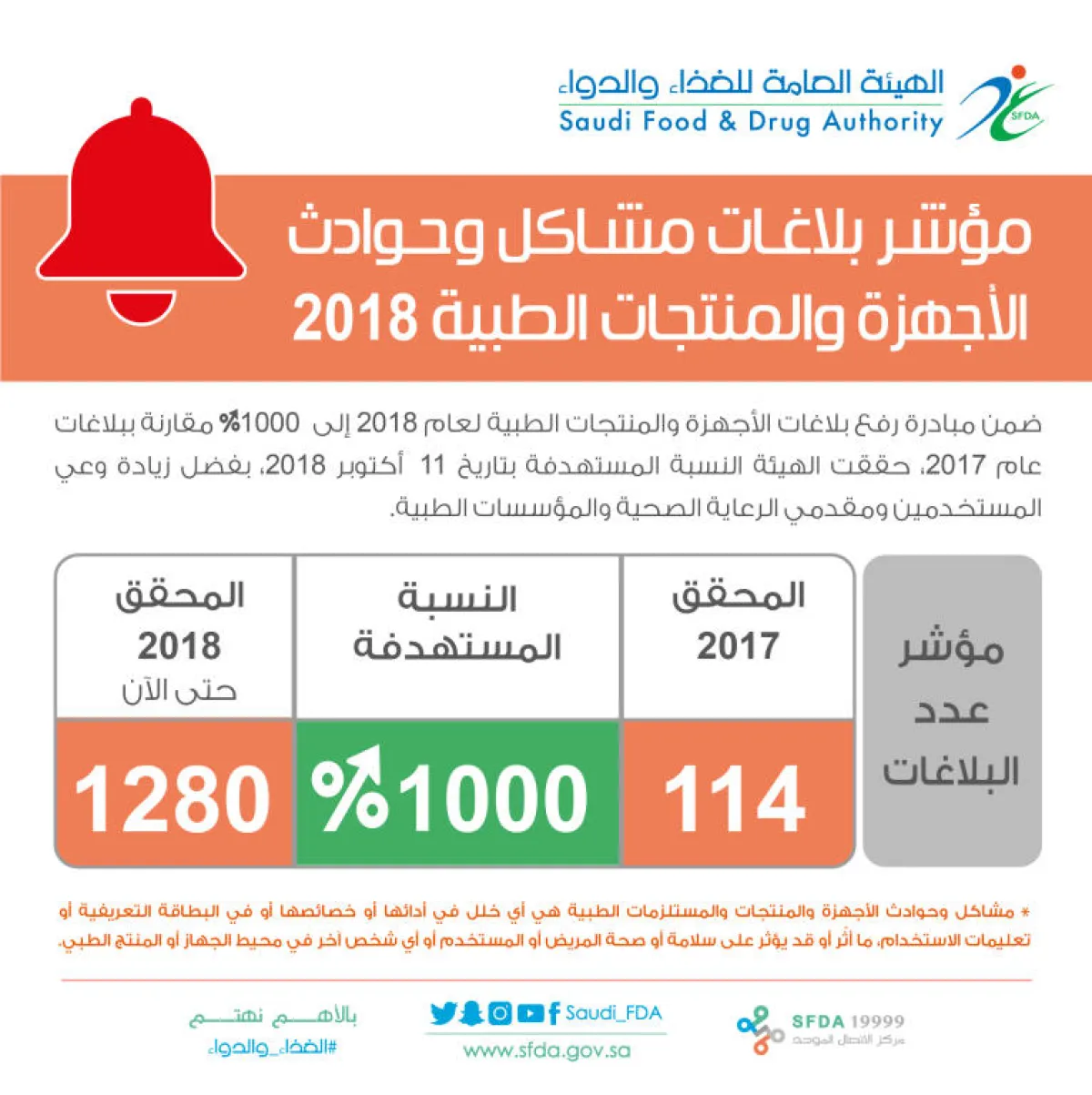 كشفت الهيئة العامة للغذاء والدواء أن عدد بلاغات مشاكل وحوادث الأجهزة والمنتجات الطبية التي استقبلتها الهيئة قفز من 114 بلاغاً عام 2017 إلى 1280 بلاغاً منذ بداية عام 2018 وحتى الآن، وهو ما حقق مبادرة الهيئة التي استهدفت رفع عدد البلاغات المستقبلة بنسبة 1000% خلال عام واحد.