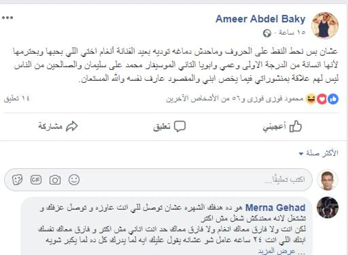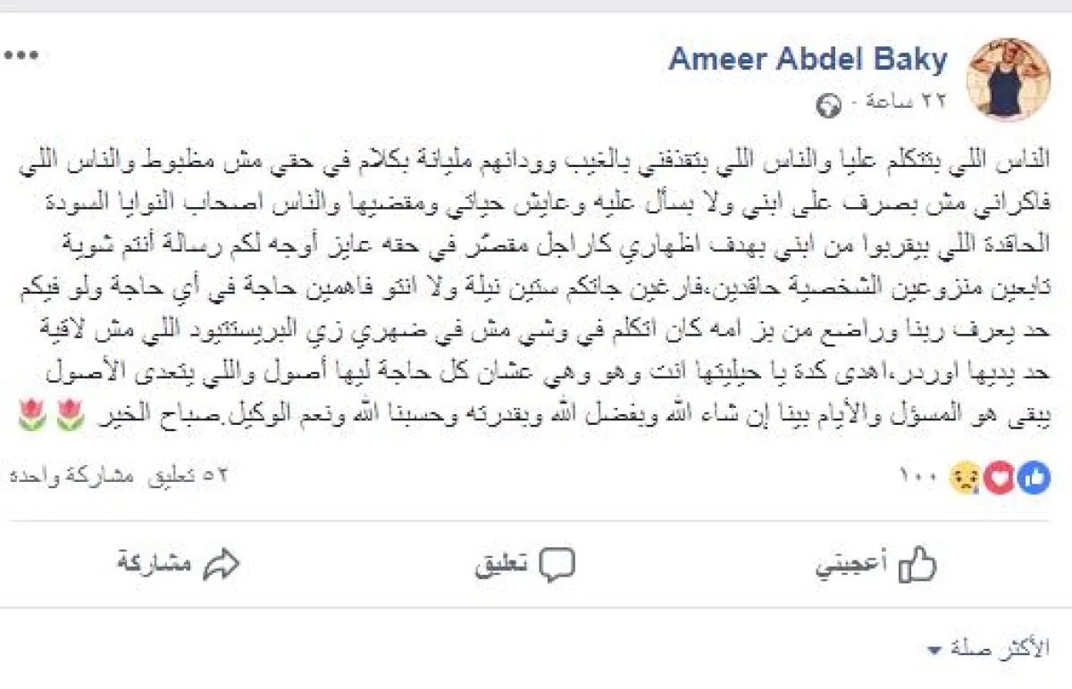 الموسيقي أمير عبد الباقي نشر مقطعاً مصوراً لصغيره ياسين وهو يقدم أغنية مهرجانات بكلمات لا تناسب عمره وعلق عليها قائلاً: هذه هي النشأة المتوقعة حين وجود ابني في المستنقع الأسفل، وقبلها كتب قائلاً: اللي يمنع ابن يتيم الأم من إن ابوه يحتضنه ويحتويه ويربيه يبقى هو ده المفسد في الأرض، وانهالت تعليقات من أصدقاء مشتركين أكدت حقه في الخوف على ابنه ولكنها وجهت له اللوم لأنه تركه منذ سنوات طويلة دون أن يراه، أو يشارك في الإشراف على تربيته، تاركاً المهمة كلها للراحلة غنوة وأسرتها.