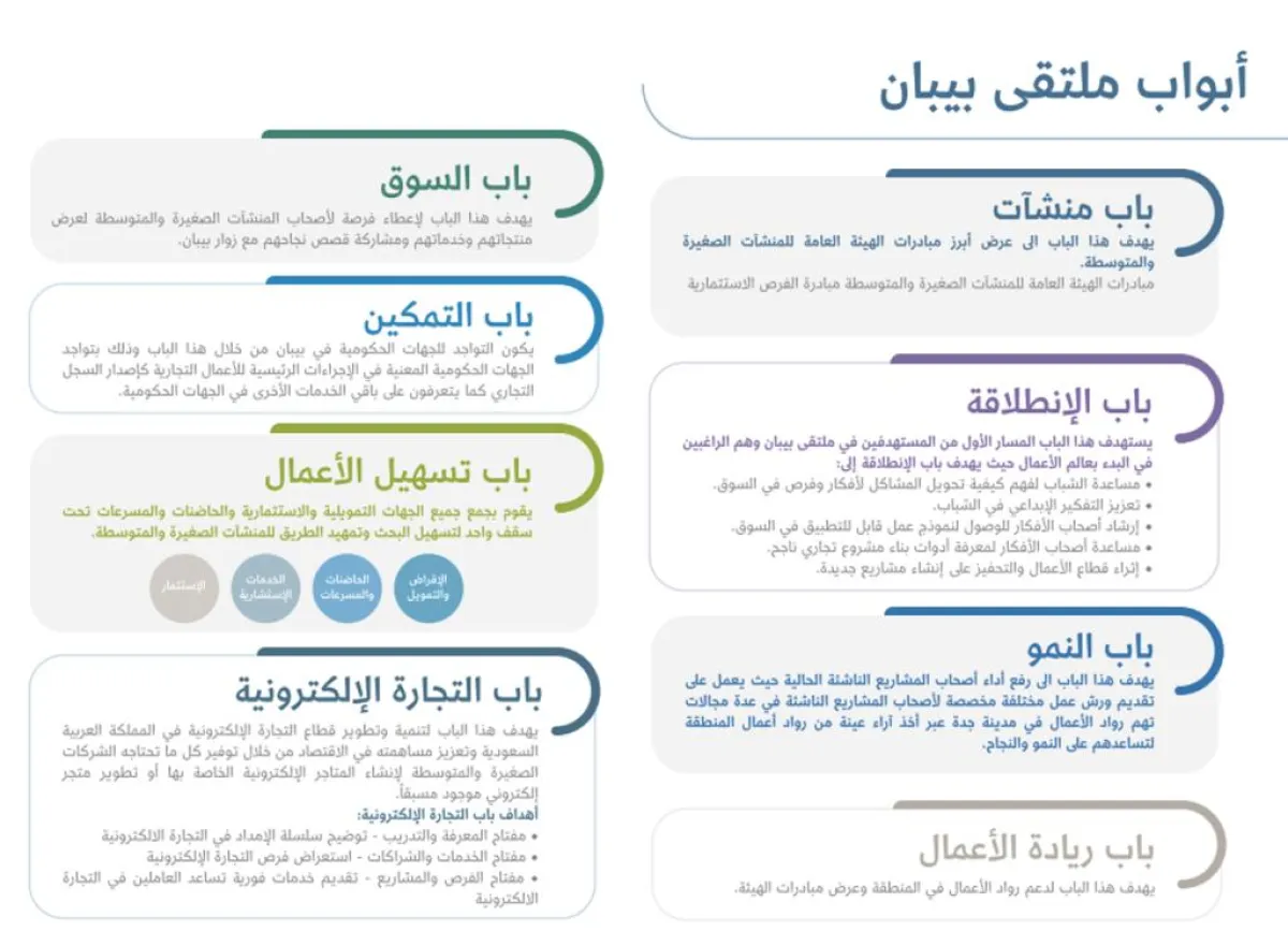 -باب تسهيل الأعمال: يقوم بجمع جميع الجهات التمويلية والاستثمارية والحاضنات والمسرعات تحت سقف واحد لتسهيل البحث وتمهيد الطريق للمنشآت الصغيرة والمتوسطة. كشركات "الإقراض والتمويل، الحاضنات والمسرعات، الخدمات الاستشارية، الاستثمار".