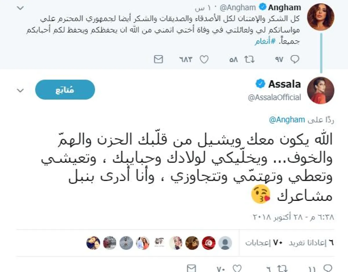 أنغام غردت عبر حسابها الموثق بموقع تويتر قائلة: "كل الشكر والامتنان لكل الأصدقاء والصديقات، والشكر أيضًا لجمهوري المحترم على مواساتكم ليّة ولعائلتي في وفاة أختي، أتمنى من الله أن يحفظكم ويحفظ لكم أحبابكم جميعًا".