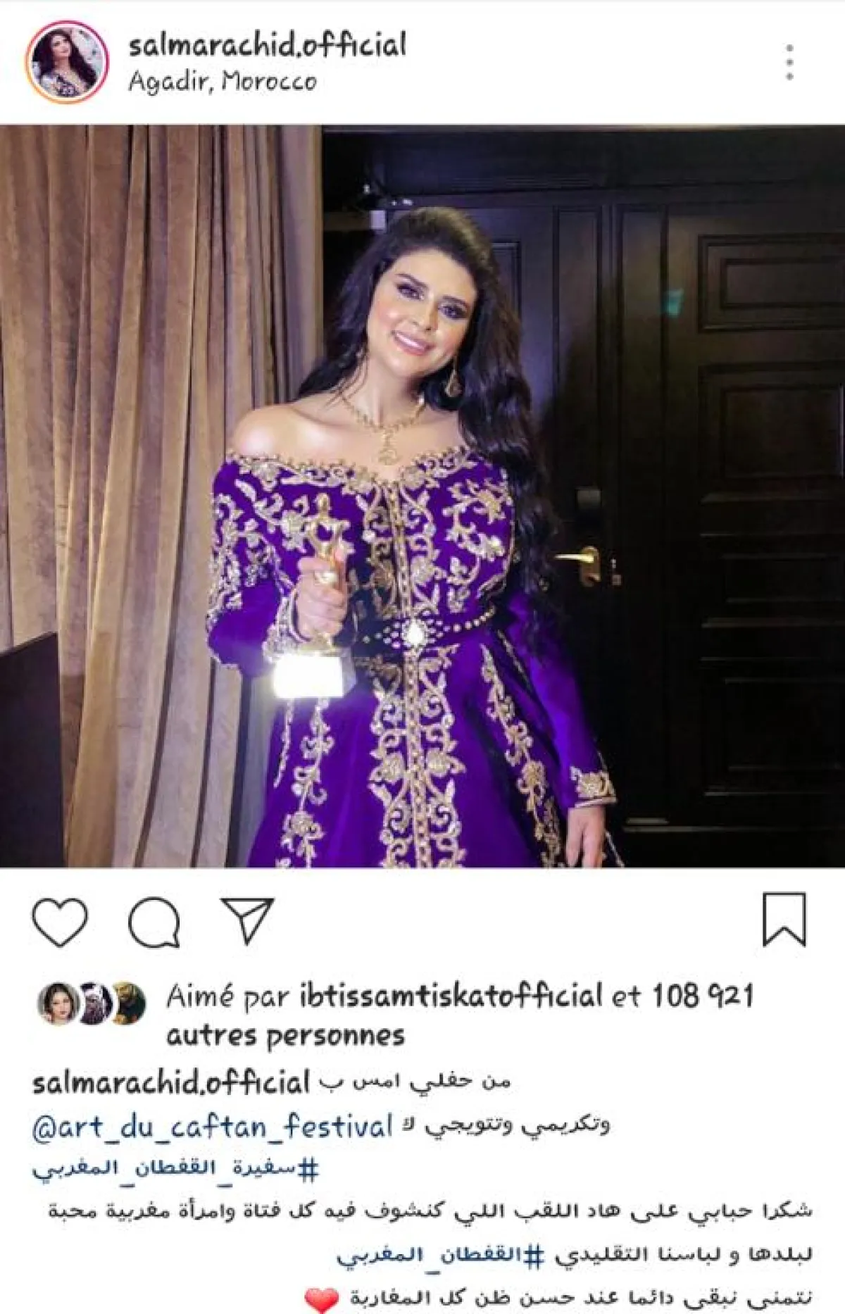 وفي منشور لها على تطبيق "الانستقرام"، عبّرت "سلمى" عن سعادتها الكبيرة بهذا اللقب، قائلة : "شكرًا أحبابي على هاد اللقب اللي كنشوف فيه كل فتاة وامرأة مغربية محبة لبلدها ولباسنا التقليدي.. نتمنى نبقى دائمًا عند حسن ظنّ كل المغاربة ".